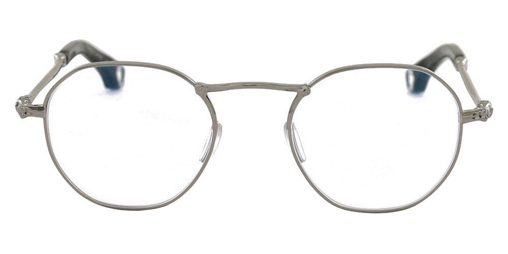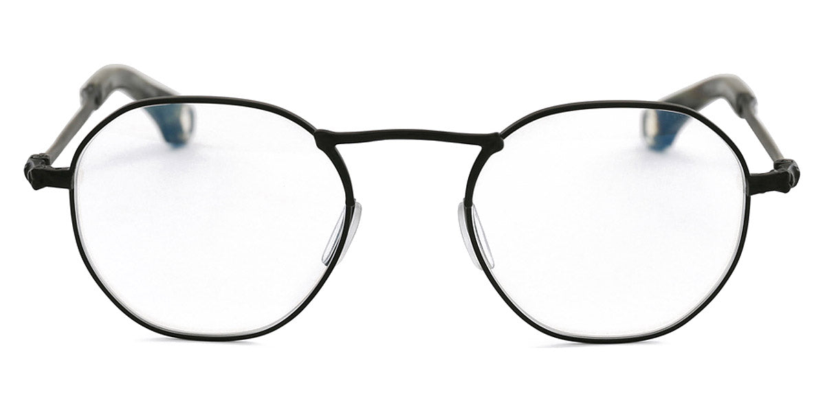 BK1002 Eyeglasses by Blake Kuwahara. Color: Gunmetal, Matte Black, Size: 49-21-145. Designed for those with a taste for the unconventional, the BK1002 eyeglasses feature an irregularly shaped panto frame with wider-than-usual rim spacing. Their avant-garde design adds a bold twist to any look, while the construction, put together for quality and longevity, offers a lightweight, comfortable fit. Perfect for trendsetters, these glasses redefine what eyewear can be.