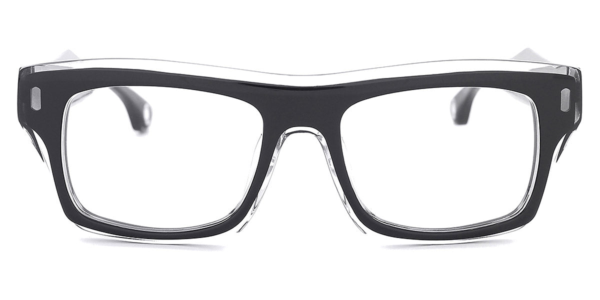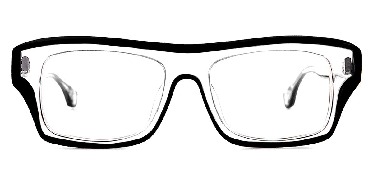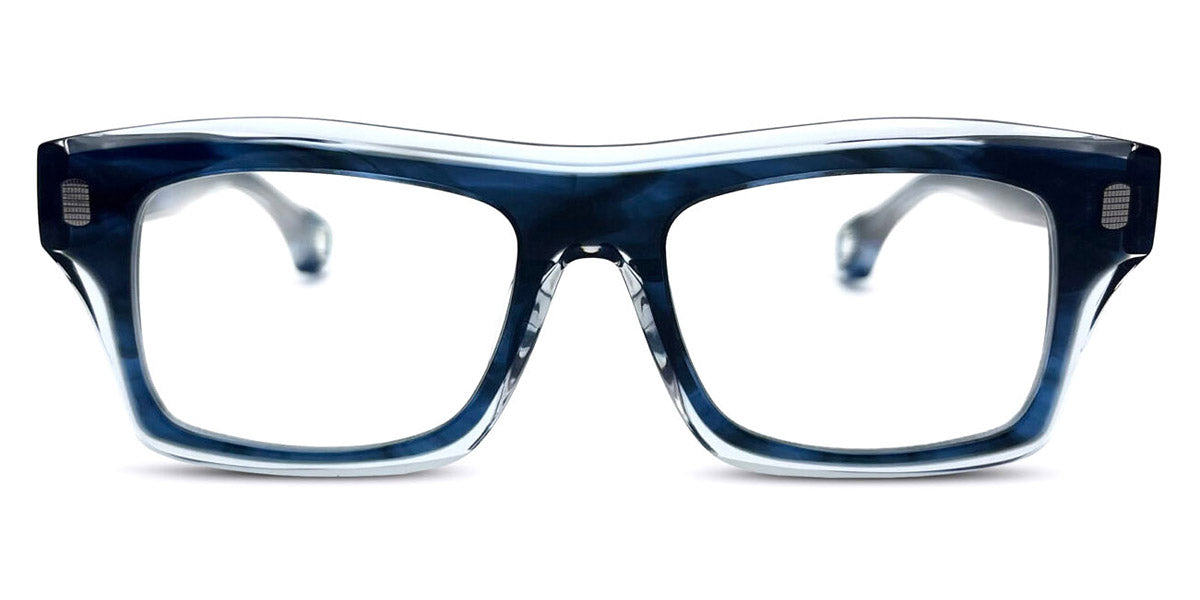 CHAMBERS Eyeglasses by Blake Kuwahara. Color: Blue Horn, Cognac, Crystal, Midnight, Size: 52-18-140. The CHAMBERS is bold, chunky, and unapologetically glorious. Featuring two contrasting frame contours, these eyeglasses are a work of art in themselves. The translucent rainbow acetate is reminiscent of stained glass, adding a layer of beauty and complexity to the design. Encased in a high-contrast black outer rim, the CHAMBERS creates a stunning visual effect any daring fashionista is sure to fall in love with.