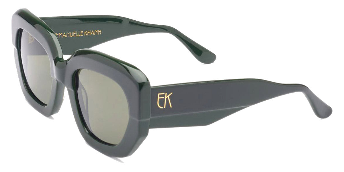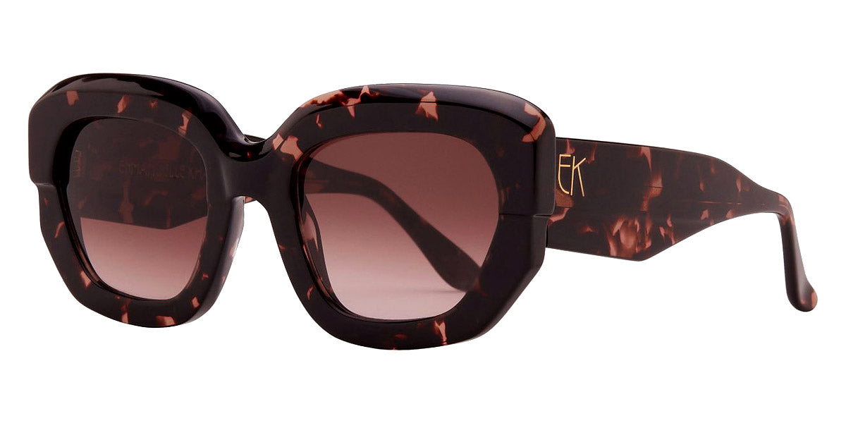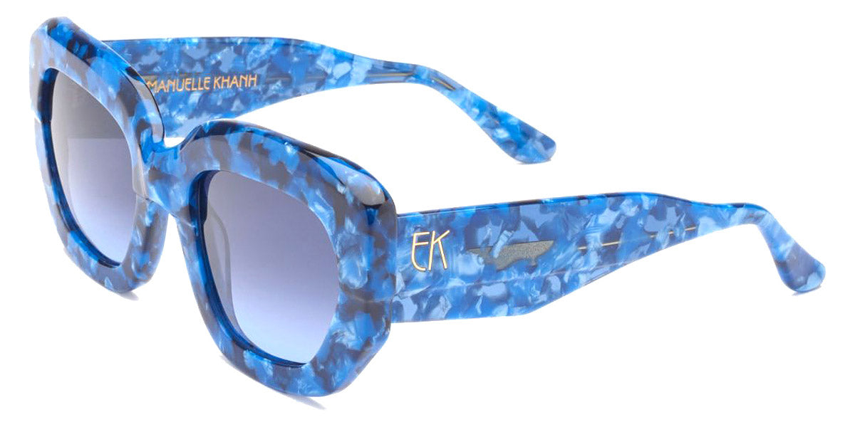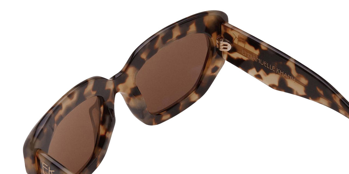 EK 8061 Sunglasses by Emmanuelle Khanh. Material: Acetate, Color: 156 - Denim Blue, 35-106 - Rosewood, 355 - Khaki, 228 - Panther Tortoise, 430 - Pink Tortoise, 35-106 - Rosewood, Size: 52-24-140. Emmanuelle Khanh's unique designs are both distinctive and modern ready-to-wear. The EK 8061 sunglasses are a fashionable and timeless accessory. Handcrafted in France, these frames feature a gold-tone logo and lenses with 100% UV protection. The rectangular shape is perfect for a glamorous, feminine look that will never go out of style. Taking successful fashion risks with bright colors and daring shapes, these shades are sure to make you stand out from the crowd.