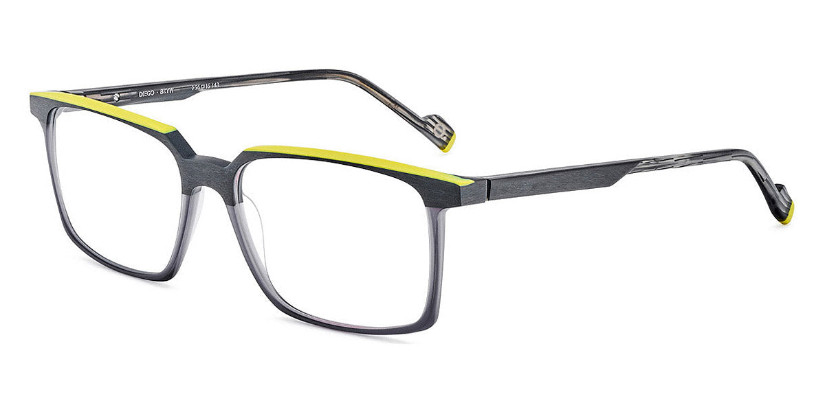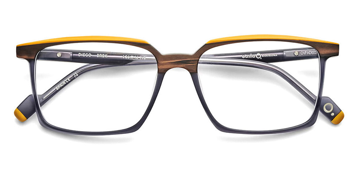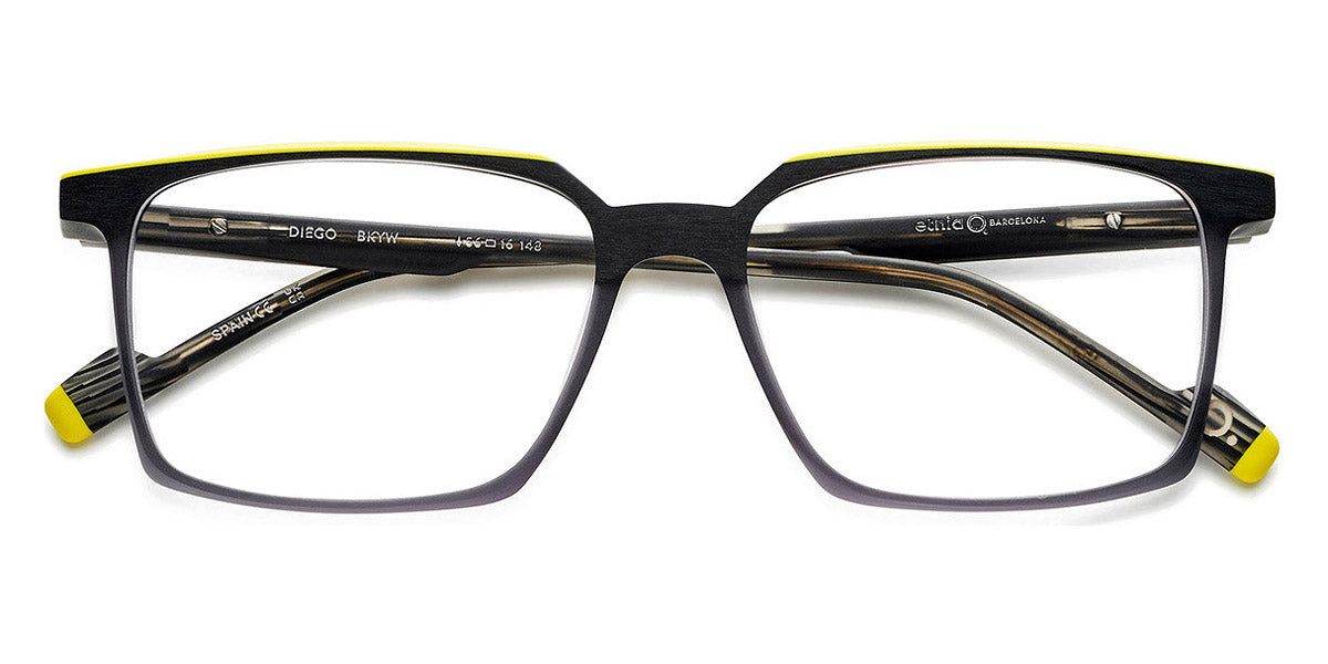 DIEGO Eyeglasses by Etnia Barcelona. Color: BKGR Black/Green, BKYW Black/Yellow, HVBL Havana/Blue, PT Grey, BKRD Black/Red, BRBK Brown/Black, Size: 54-16-148, 56-16-148. The DIEGO combines minimalism with a playful touch, bringing classic wayfarers into colorful territory. Slim and streamlined in design, they balance their no-frills frame with a variety of vivid palettes, adding character while staying understated. With its refined yet spirited style, the DIEGO is here to bring you lightweight comfort and unmissable flair.
