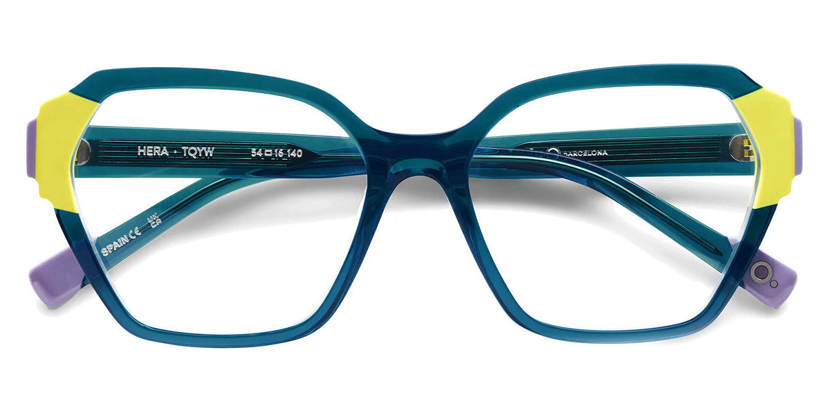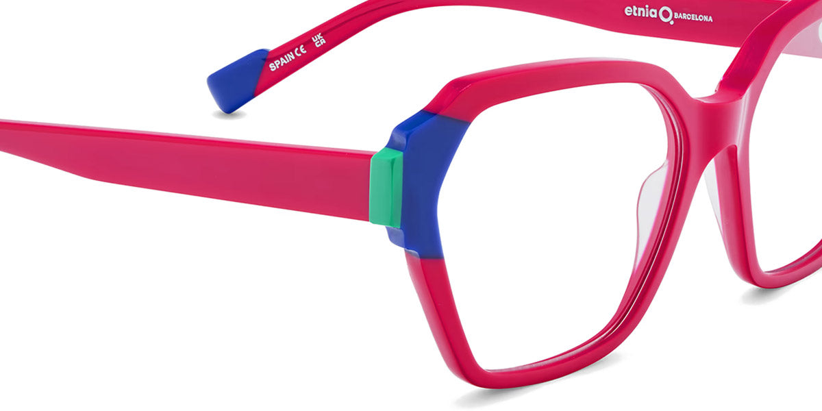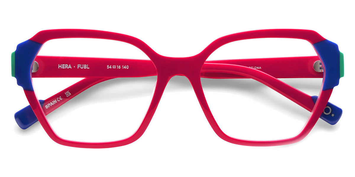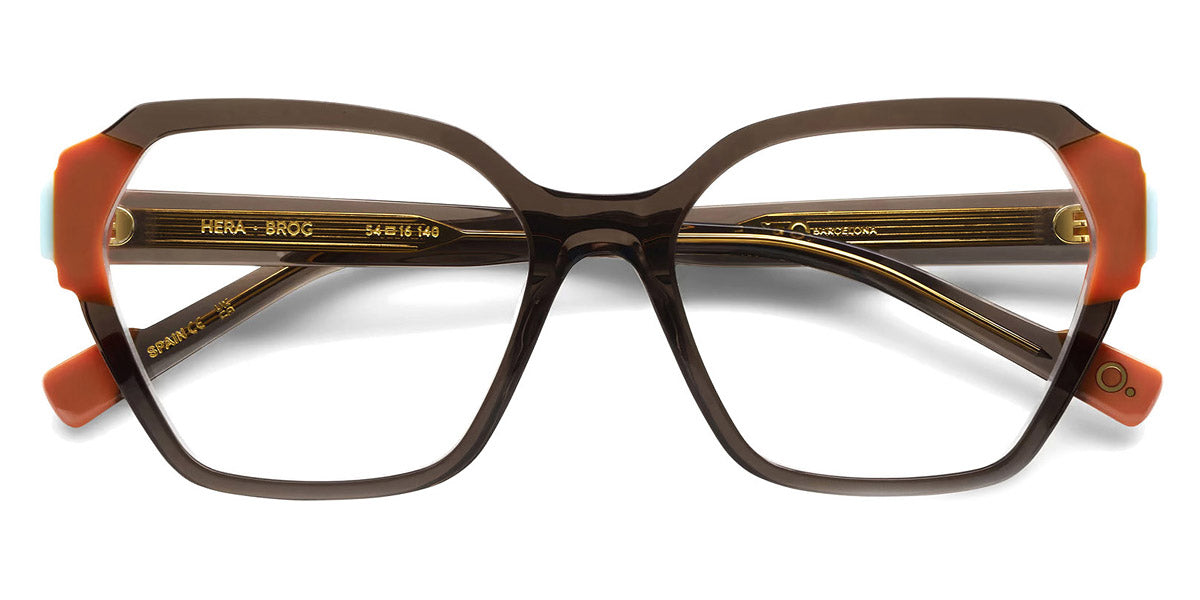 HERA Eyeglasses by Etnia Barcelona. Color: BROG Brown/Orange, CLRD Transparent/Red, FUBL Pink/Blue, TQYW Blue/Yellow, Size: 54-16-140. Bold and geometric, the HERA eyeglasses command attention with their sculpted temples and vibrant color options. The angular frame design adds a contemporary flair, while lightweight acetate ensures a comfortable fit. From rich jewel tones to playful pastels, their palette offers something for every personality. Perfect for those seeking a daring look, these frames combine artistic expression with everyday practicality.