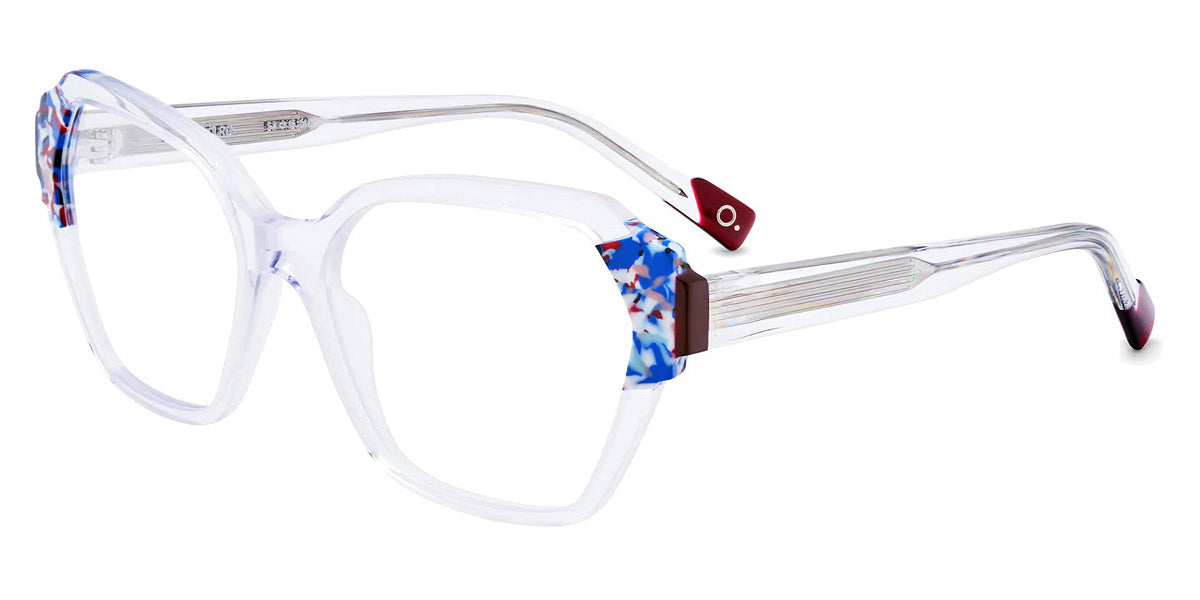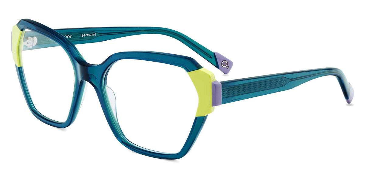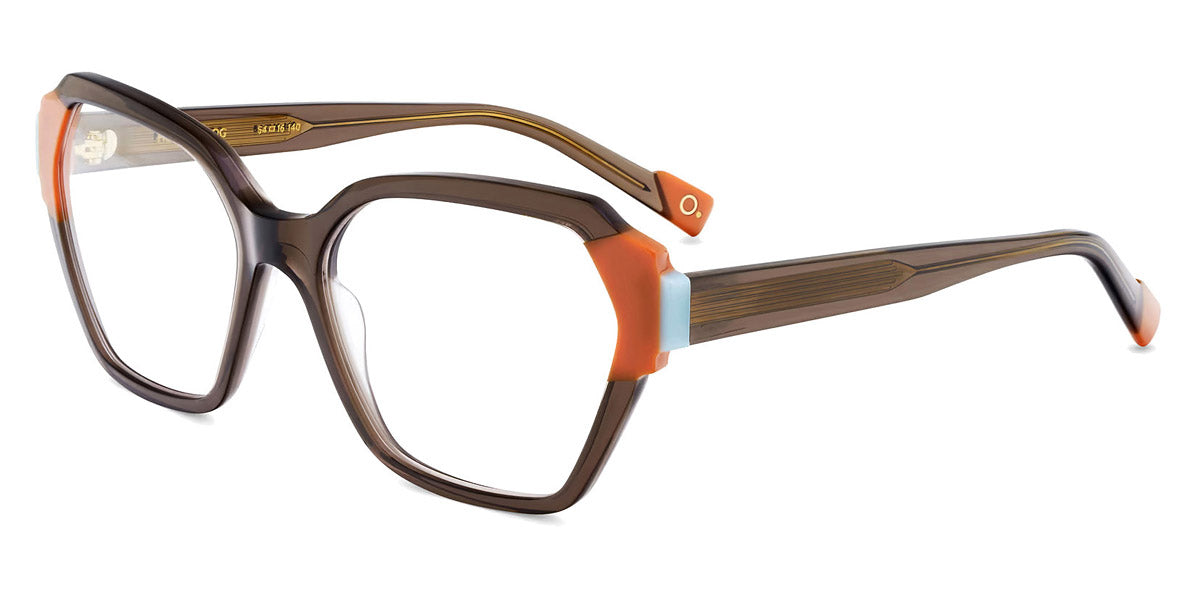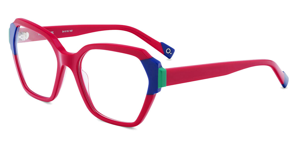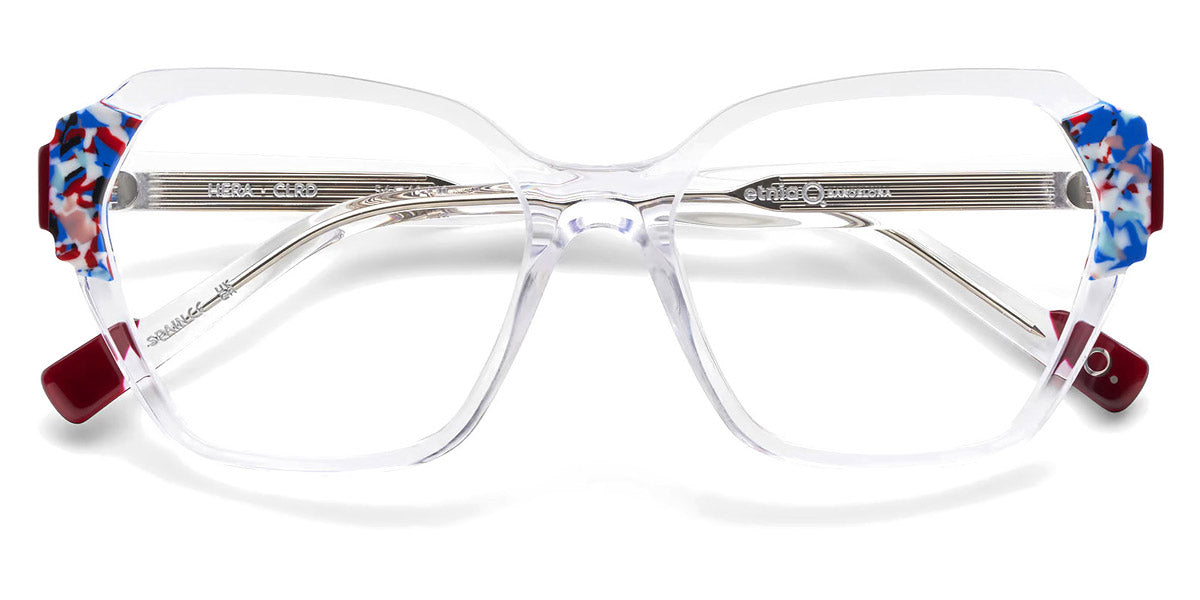 HERA Eyeglasses by Etnia Barcelona. Color: BROG Brown/Orange, CLRD Transparent/Red, FUBL Pink/Blue, TQYW Blue/Yellow, Size: 54-16-140. Bold and geometric, the HERA eyeglasses command attention with their sculpted temples and vibrant color options. The angular frame design adds a contemporary flair, while lightweight acetate ensures a comfortable fit. From rich jewel tones to playful pastels, their palette offers something for every personality. Perfect for those seeking a daring look, these frames combine artistic expression with everyday practicality.