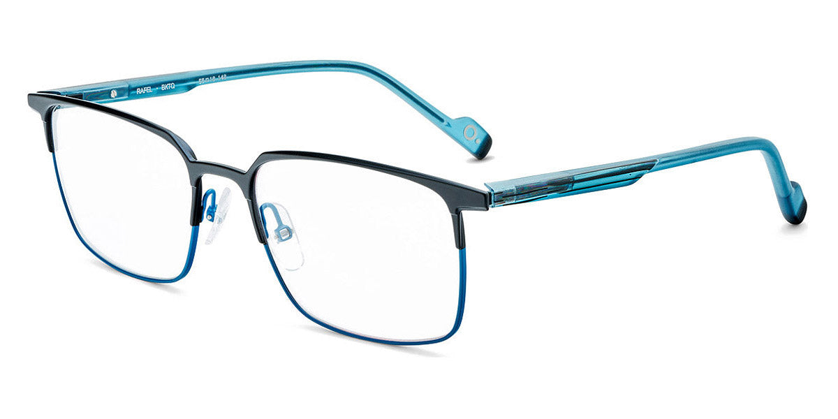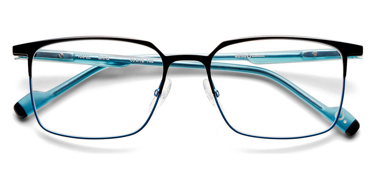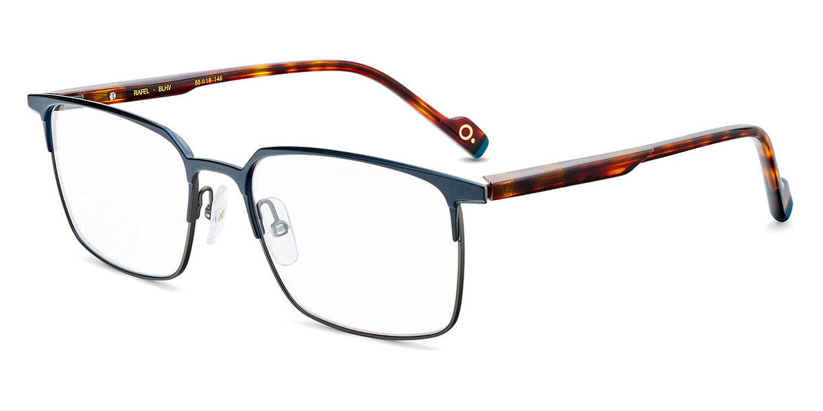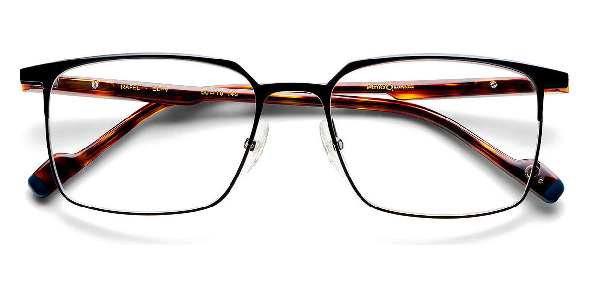 RAFEL Eyeglasses by Etnia Barcelona. Color: BKTQ Black/Blue, BLHV Blue/Havana, GRRD Green/Red, OGBK Orange/Black, Size: 55-18-148. With a smart rectangle design, the RAFEL eyeglasses capture the essence of minimalist refinement. Crafted from high-quality materials, they offer a slim profile that remains sturdy while weighing almost nothing, providing comfort without compromising style. The understated tones lend a versatile appeal, blending seamlessly with both professional and casual looks. Step out elegantly and confidently wearing the RAFEL frames.