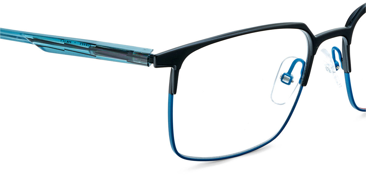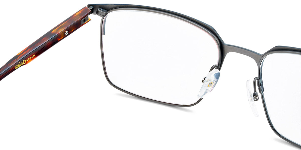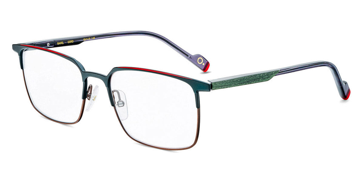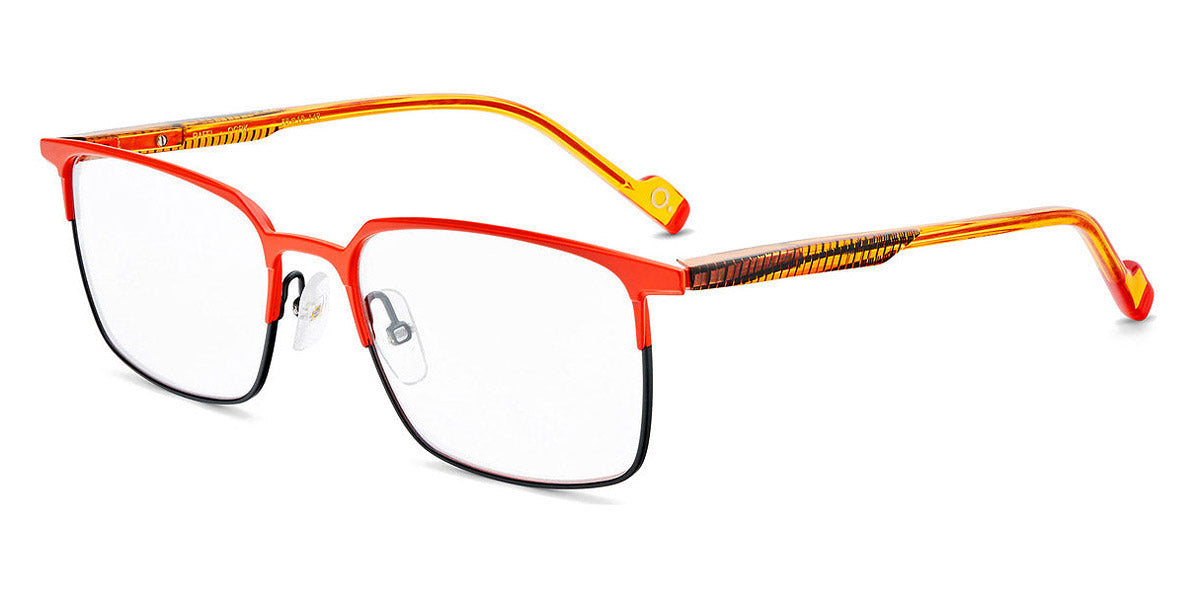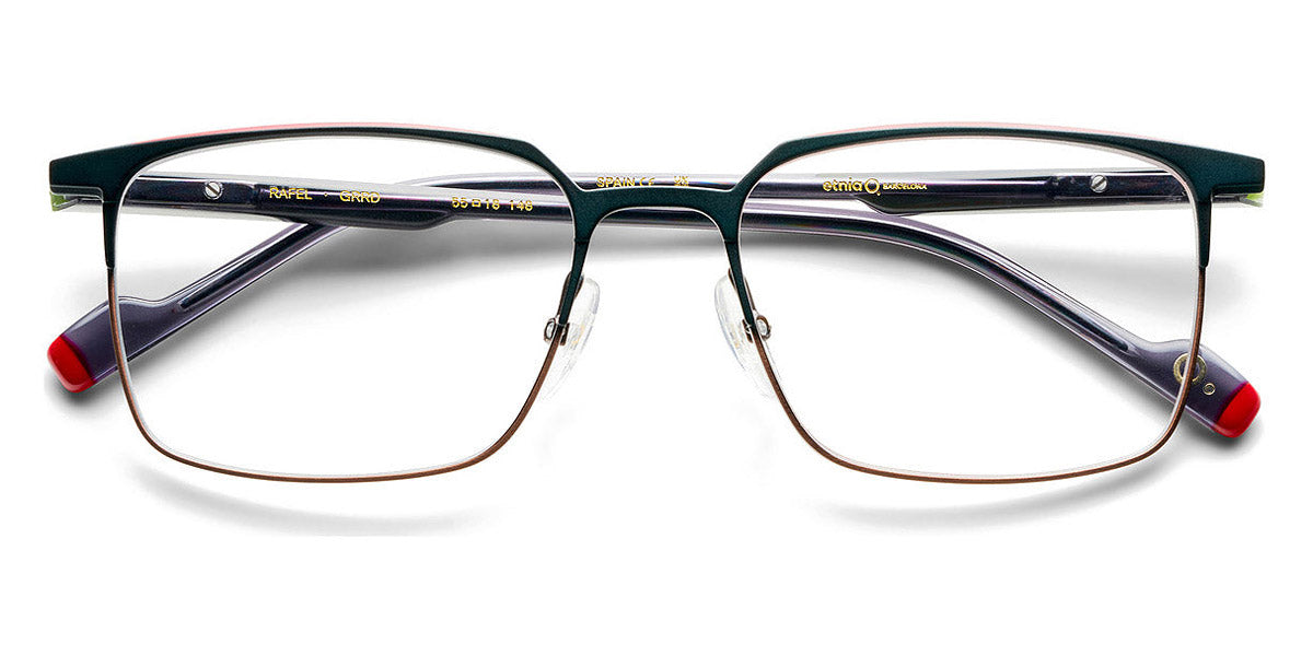 RAFEL Eyeglasses by Etnia Barcelona. Color: BKTQ Black/Blue, BLHV Blue/Havana, GRRD Green/Red, OGBK Orange/Black, Size: 55-18-148. With a smart rectangle design, the RAFEL eyeglasses capture the essence of minimalist refinement. Crafted from high-quality materials, they offer a slim profile that remains sturdy while weighing almost nothing, providing comfort without compromising style. The understated tones lend a versatile appeal, blending seamlessly with both professional and casual looks. Step out elegantly and confidently wearing the RAFEL frames.