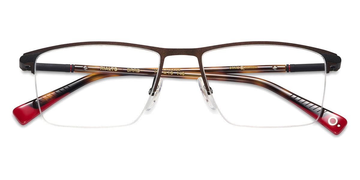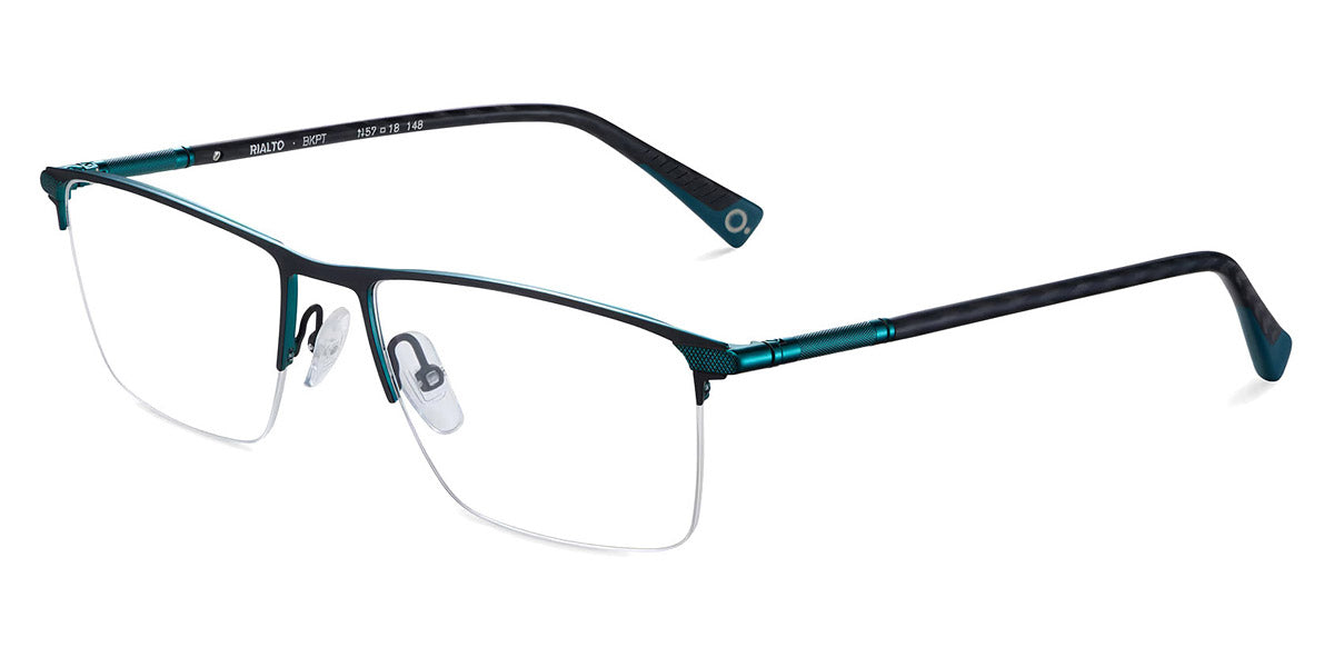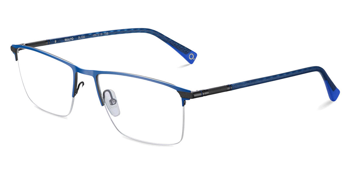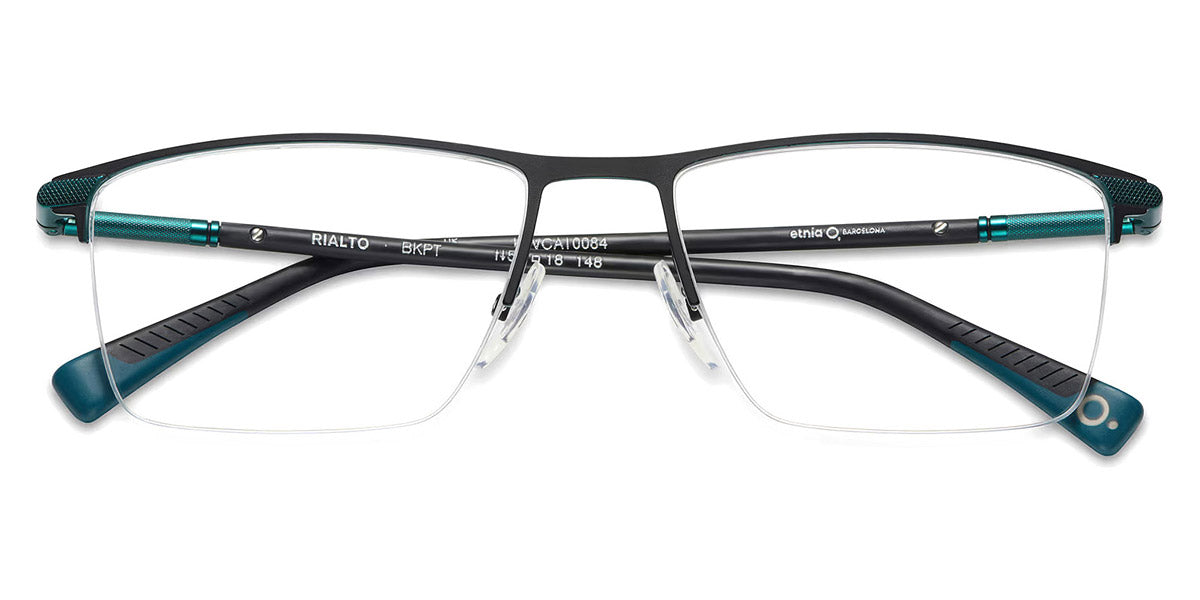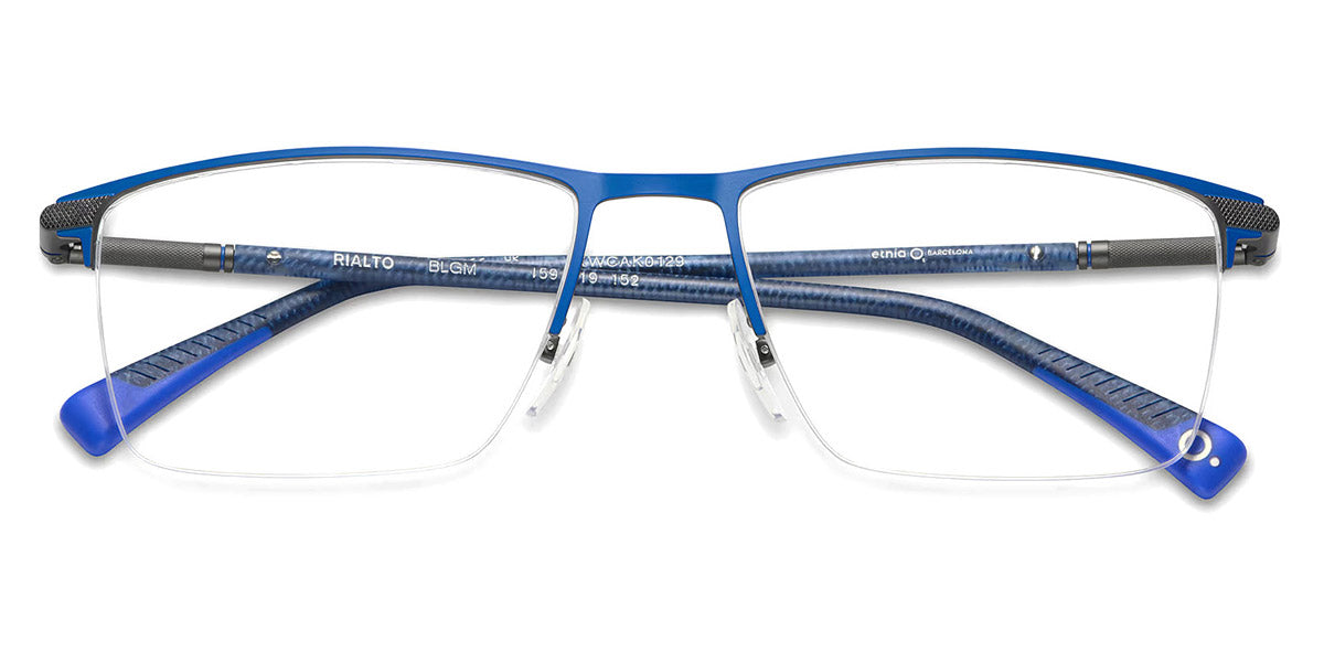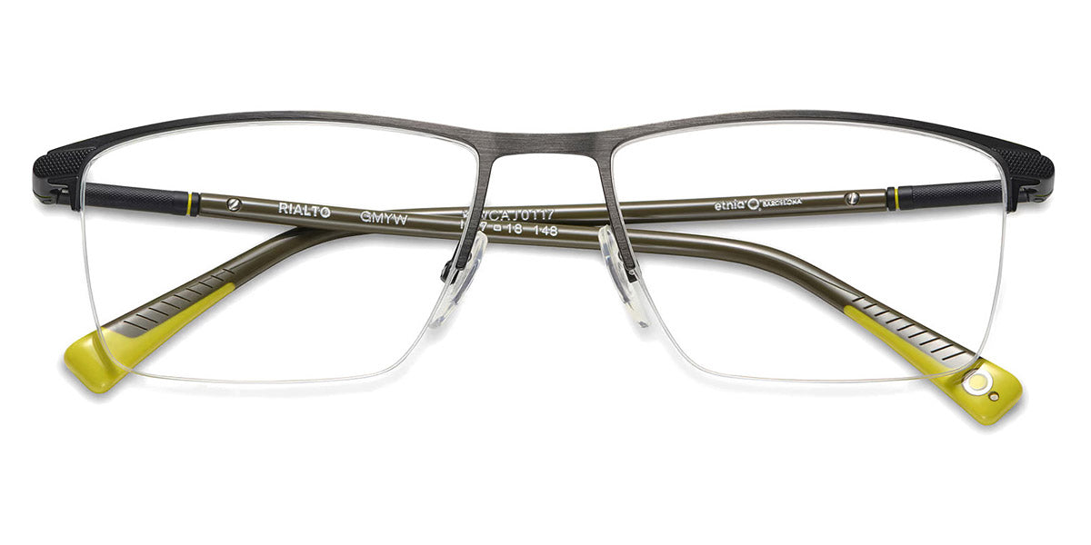 RIALTO Eyeglasses by Etnia Barcelona. Color: BKPT BK/PT, BLGM Blue/Grey, BRRD Brown/Red, GMYW Grey/Yellow, Size: 55-18-148, 57-18-148, 59-19-152. The RIALTO eyeglasses evoke timeless elegance with their rectangular design, combining a sharp aesthetic with functional proportions. The lightweight frame features a color-accentuated browline, creating a silhouette that is understated yet bold. Designed with a slightly retro edge, the model gives off an intellectual vibe while remaining contemporary. With a range of colorways, each marked by Etnia Barcelona's artistic touch, the RIALTO is perfect for those seeking a refined and distinguished appearance.