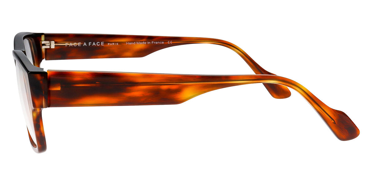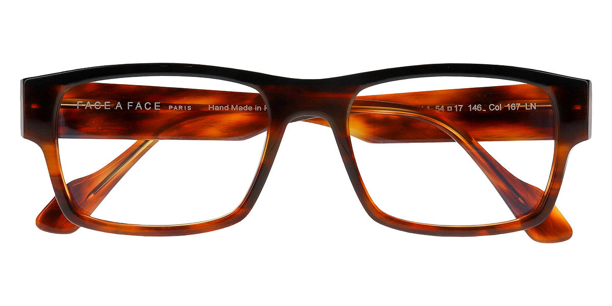 ARMAN 1 Eyeglasses by Face A Face. Color: Black (100), Blue Gray (4012), Brown Horn (167), Mondrian Gray (0643), Tortoise Black Green (0427), Transparent Striped Amber (4321), Size: 54-17-146. Audacious, artistic, extraordinary… FACE A FACE glasses are at the cutting edge of design. Every frame is meticulously crafted by artisans using only the highest-quality materials: from 100% organic acetate to space-grade titanium. The resulting glasses are durable, lightweight, flexible, hypoallergenic, and most important of all, comfortable. And once coated in the exclusive FACE A FACE color palette, they are nothing short of magic. Full of spirit, light and personality, the spectacles cultivate boldness and vitality.