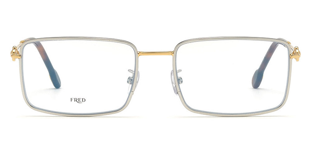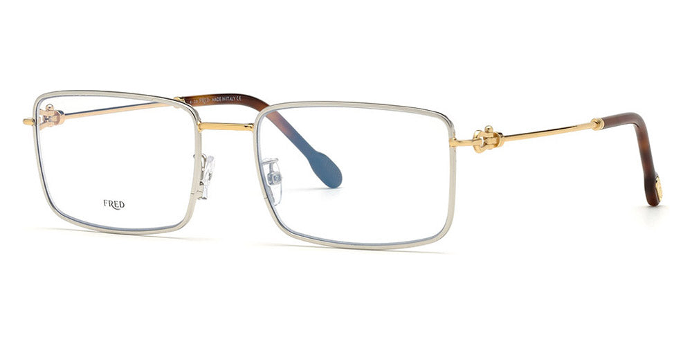 FG50001U Eyeglasses by Fred. Color: Shiny Endura Gold, Shiny Rhodium, Size: 57-18-140. If you’re looking for truly outstanding eyewear pieces, the FRED Paris glasses will meet all your needs. Each frame showcases the brand’s passion for contemporary glamor and sparkling, relaxed elegance. The glasses feature subtle touches of diamonds, gemstones, and other details that echo the iconic hallmarks of the brand: the nautical cable, marine carabiner, lemniscate, buckle in a figure of 8, and other unique, authentic elements. By combining premium materials with Italian craftsmanship, FRED Paris gives birth to unrivaled jewelry creations, designed for driven and passionate personalities.
