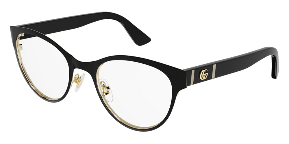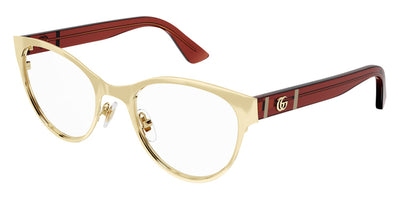 GG1114O Eyeglasses by Gucci. Color: Black, Gold/Red, Size: 52-20-145. Gucci glasses are glamorous and chic, with bold contours and exaggerated volumes, which are ultimate forms of self-expression. Inspired by the vintage era, the reinterpreted iconic eyewear silhouettes are embellished with elaborate decorations and bright colors. Each and every design represents the pinnacle of Italian craftsmanship and is unsurpassed for its quality and attention to detail. Every new collection is a range of striking shapes and colors; an outstanding mix of playful vibes with retro undertones.