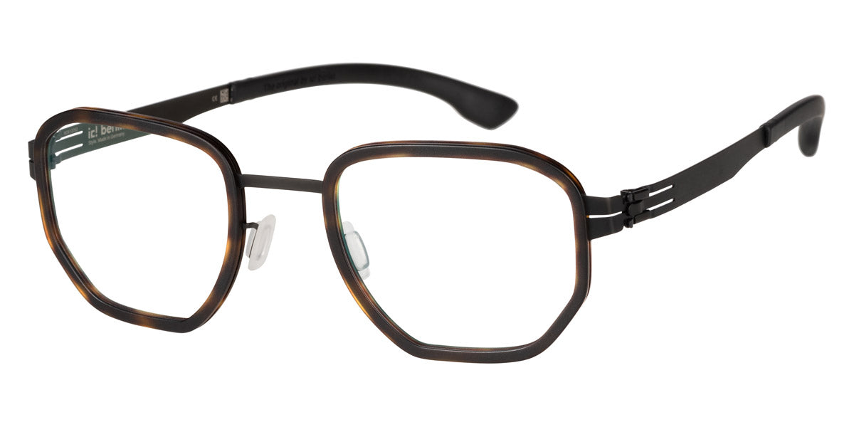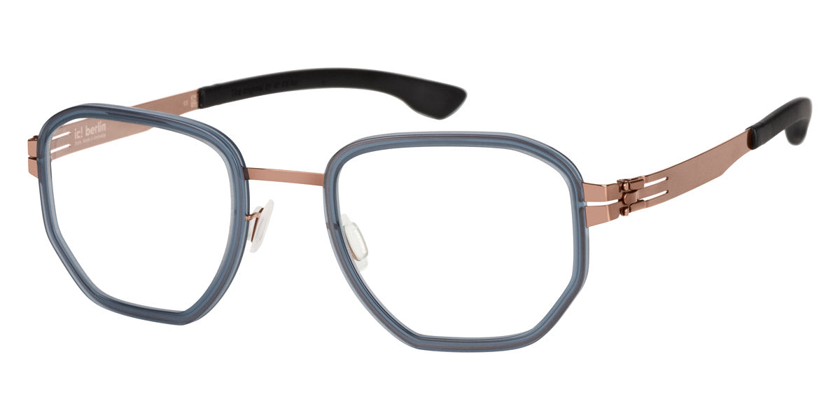 Hiro by Ic! Berlin. Color: Black Havana Matte, Gunmetal Sky Gray, Rough Black, Shiny Copper Blue Waters, Size: 46-18-145. What happens if combine handcrafted German quality with fashionable and bold designs? Meet the Hiro, a stunning optical frame that features aluminum construction and luxurious acetate ring offered in exclusive contrasting colors such as Blue Water with Shiny Copper. Its small faceted panto shape provides a contemporary and sophisticated look along with an ultra-light wearing experience.