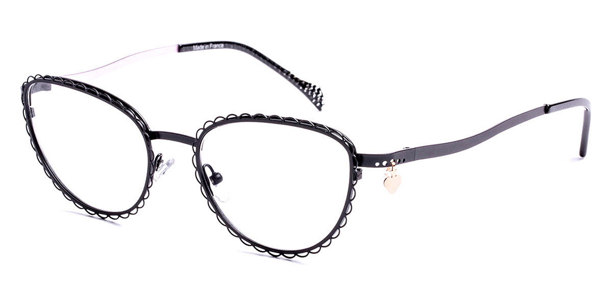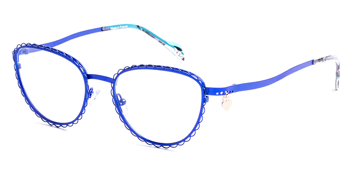 Idalia Eyeglasses by J.F. Rey. Color: 0080 Black/Pink, 1050 White Gold Lace, 2020 Blue, 5020 Light Gold/Blue, Size: 52-18-140. Presenting the Idalia eyeglasses designed for women by J. F. Rey. These glasses showcase an elegant cat-eye shape design, featuring a full-rim metal frame. Available in four distinct color combinations and sizes, this model offers a variety of options to cater to different preferences. The metal frame is ingeniously composed of a central bar on which the rims are suspended. Each rim is adorned with delicate openwork decorations that pay homage to Mexican culture. Adding to the charm, a small removable pendant graces the rim, featuring either an inverted spike or sacred heart, depending on your perspective. J. F. Rey, the French brand, artfully blends disparate qualities to create a look of seamless perfection. Their eyeglasses effortlessly encompass elements of tradition, boldness, and flair, while maintaining an unassuming allure. Donning J. F. Rey's frames requires a touch of charisma and inner strength, as the brand's distinctiveness is unparalleled and irreplaceable. In crafting their eyeglasses, only materials with a proven history of excellence are employed.