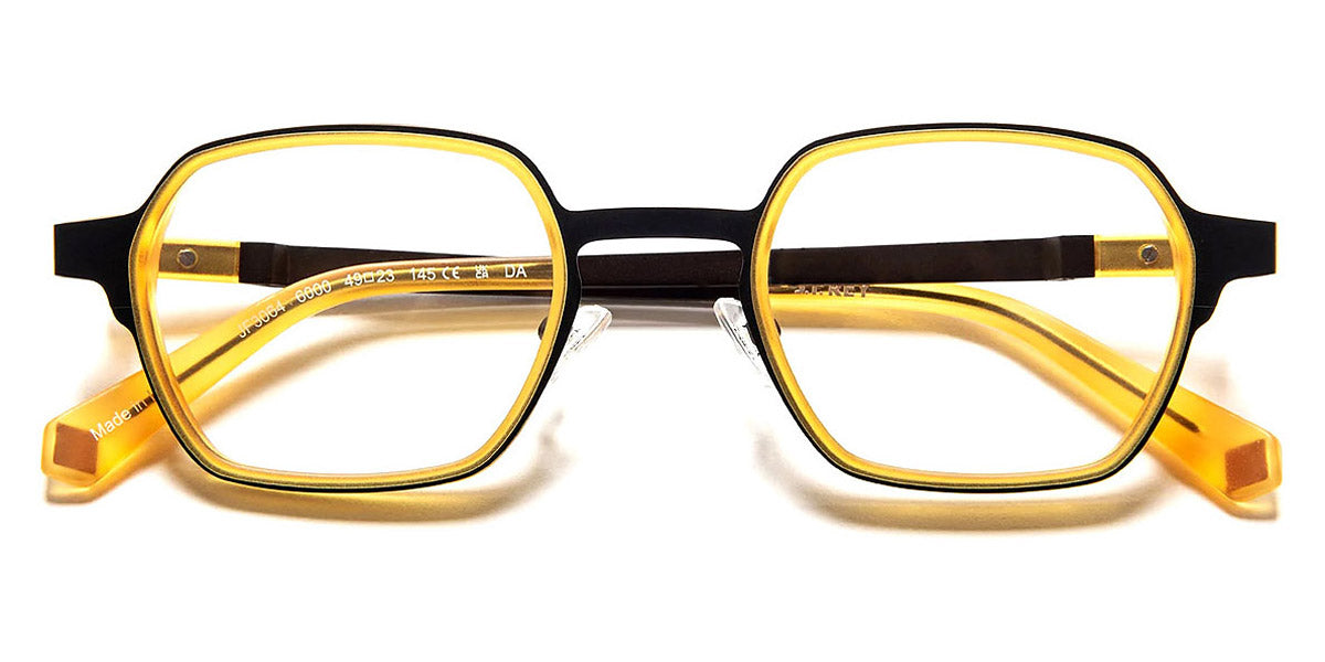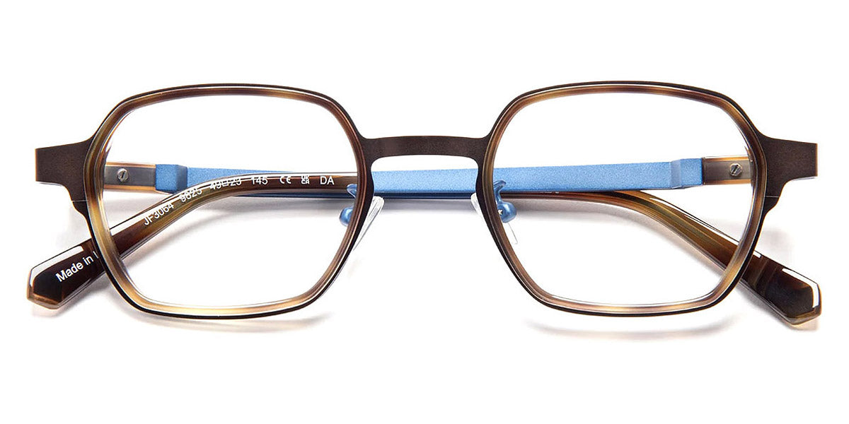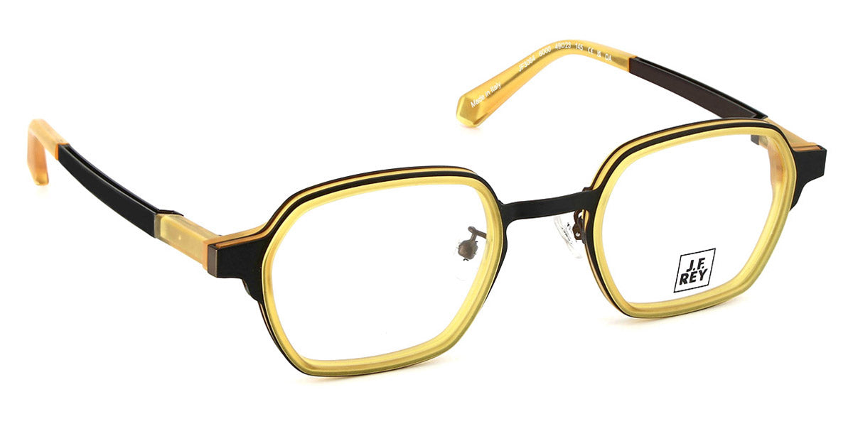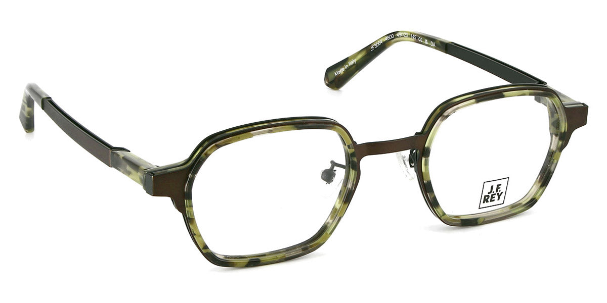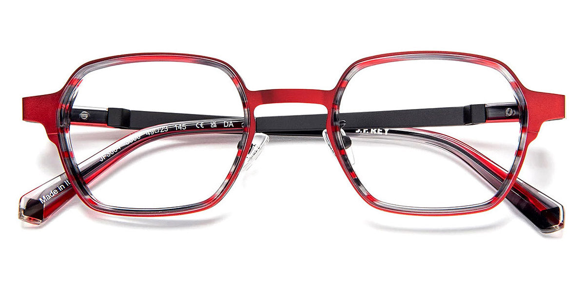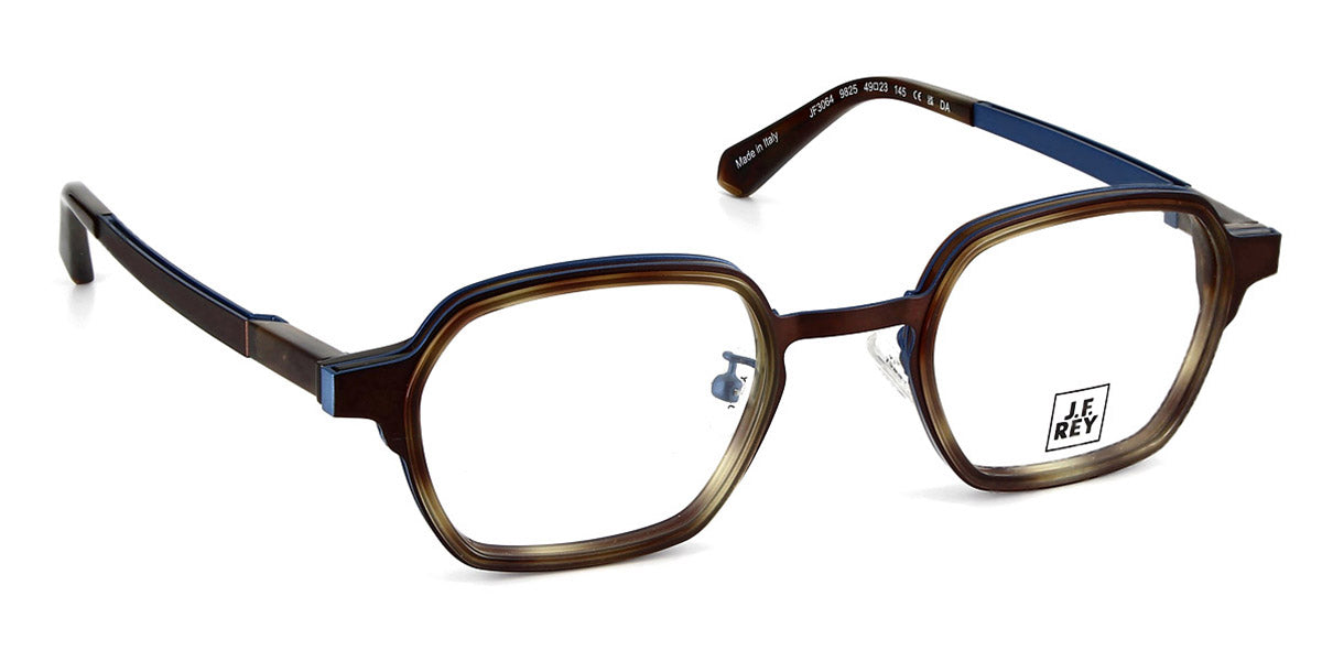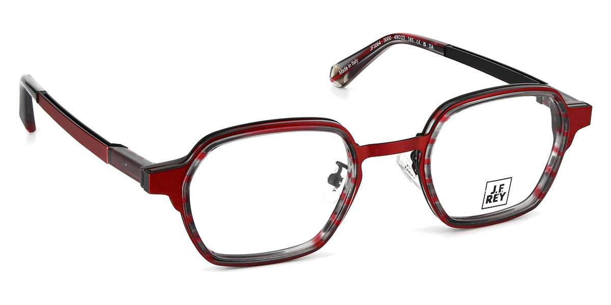 JF3064 Eyeglasses by J.F. Rey. Color: 3000 Red/Black, 4800 Military/Black, 6000 Orange/Black, 9825 Brown/Blue, Size: 49-23-145.