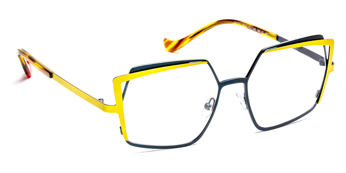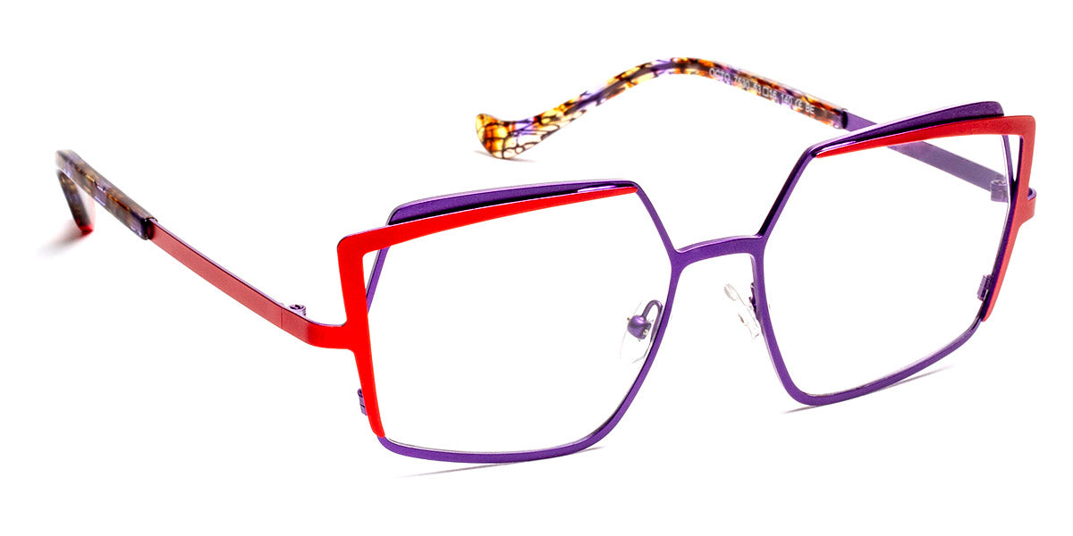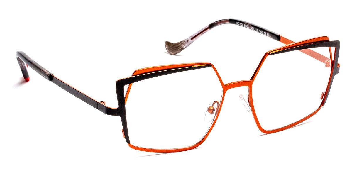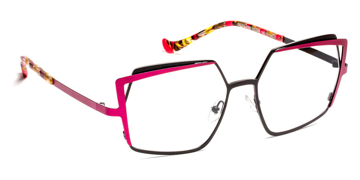 Octo Eyeglasses by J.F. Rey. Color: 0082 Black/Fuchsia, 2540 Blue/Anise Green, 6600 Copper/Black, 7530 Purple/Red, Size: 53-16-140. Dive into the future of eyewear fashion with the Octo glasses from J. F. Rey. Inspired by the mathematical precision of octagonal shapes, this model showcases a bold design that commands attention. The geometric lines and meticulously crafted frame exemplify a harmonious fusion of form and function, making Octo a daring choice for individuals who embrace cutting-edge sophistication.