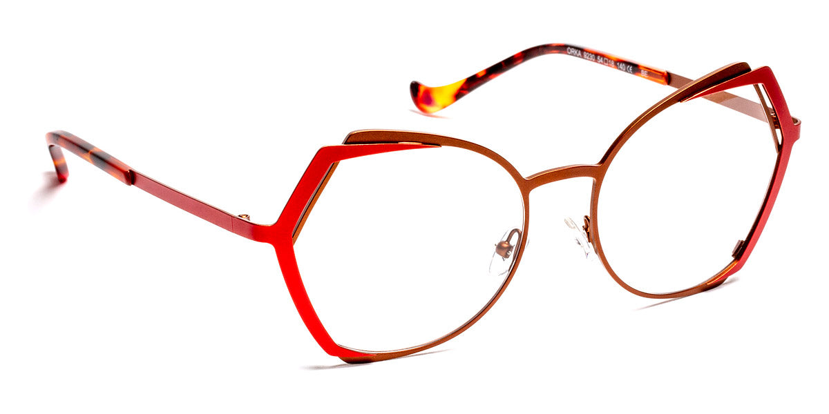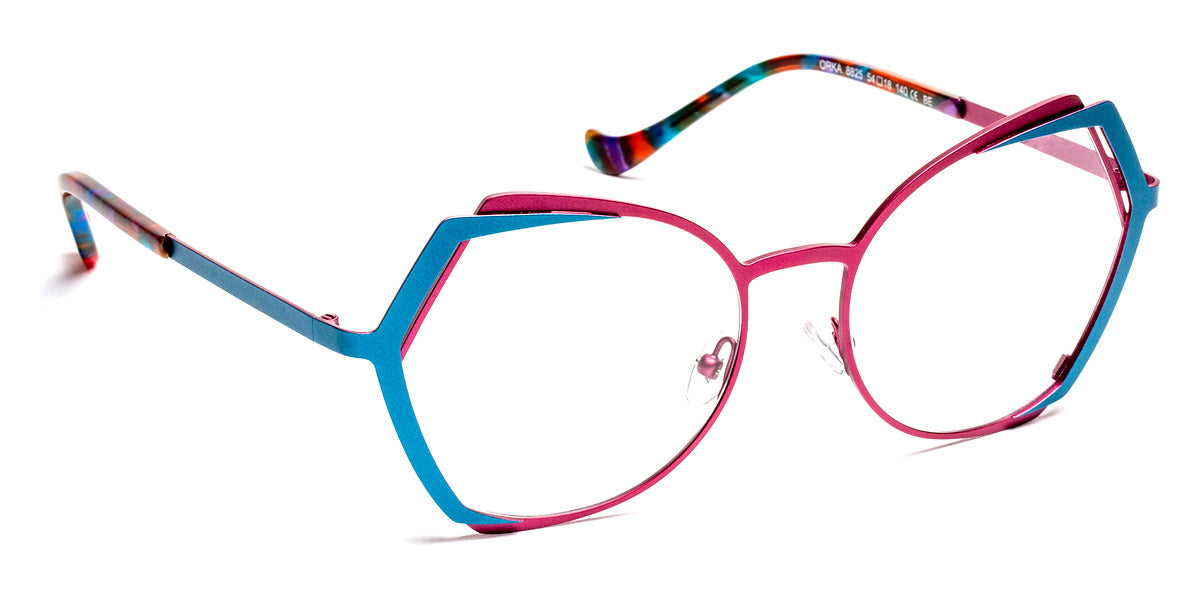 Orka Eyeglasses by J.F. Rey. Color: 8068 Pink/Coral, 8825 Dark Pink/Blue, 9230 Brown/Red, Size: 54-18-140. Meet avant-garde fashion with the Orka glasses by J. F. Rey. These frames redefine the ordinary, featuring asymmetrical lines and bold color contrasts that demand attention. The fusion of matte and glossy finishes adds a touch of modernity, making Orka a statement piece for those who appreciate eyewear as a canvas for self-expression.