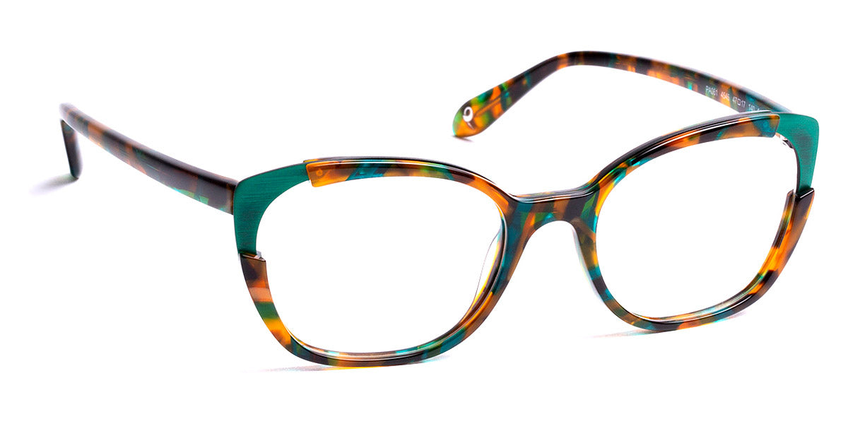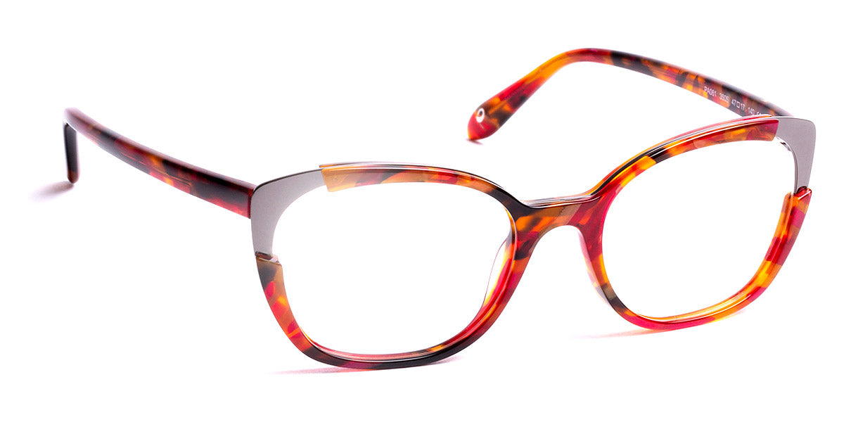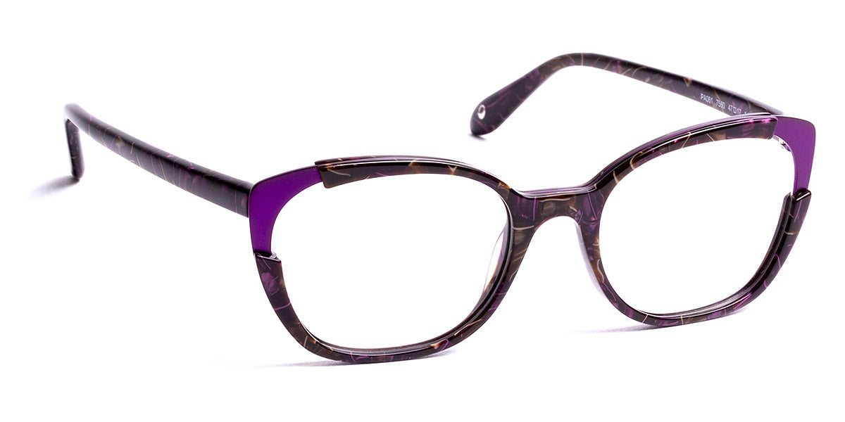 PA061 Eyeglasses by J.F. Rey. Color: 3505 Red Lace/Shiny Gunmetal, 4545 Demi Green/Brushed Green, 7560 Demi Purple/Plum, Size: 47-17-140. Redefine classic charm with the PA061 glasses by J. F. Rey. These frames draw inspiration from vintage aesthetics, featuring a rounded silhouette and intricate detailing on the temples. The combination of bold colors and subtle patterns adds a touch of whimsy, making PA061 the perfect choice for those who seek eyewear that exudes both timeless charm and playful sophistication.