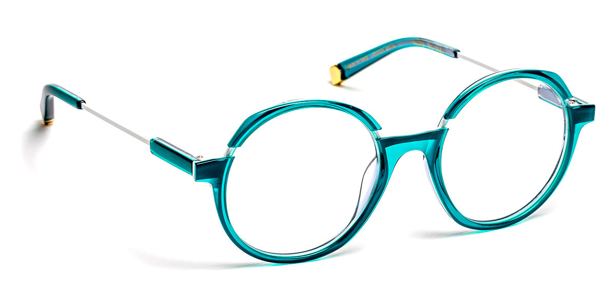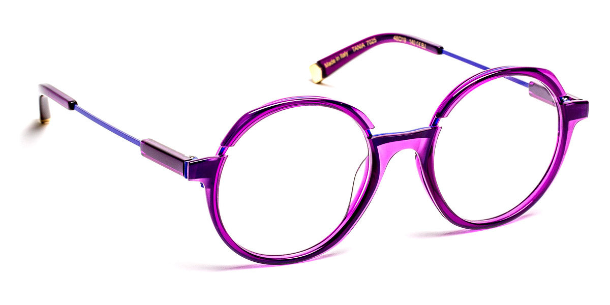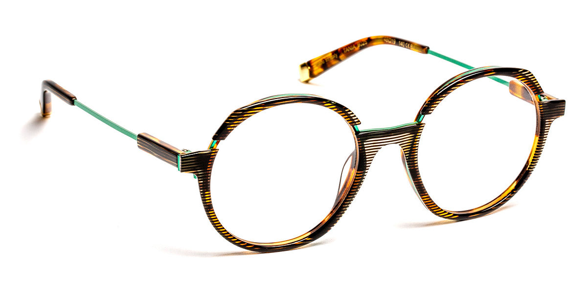 Tania Eyeglasses by J.F. Rey. Color: 2510 Blue Green Transparent/White, 3065 Red and Brown Transparent/Copper, 7025 Purple Transparent/Blue Electric, 9025 Brown and Black Striped/Mint, Size: 48-19-140. Meet the Tania from J.F. Rey, which combines modern design with timeless sophistication. These glasses feature a harmonious blend of metal and acetate elements, creating a look that is both sophisticated and edgy. A versatile accessory that effortlessly transitions from day to night, the Tania is a must-have for those who appreciate eyewear that complements their dynamic lifestyles.