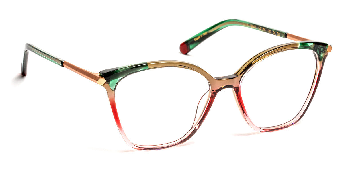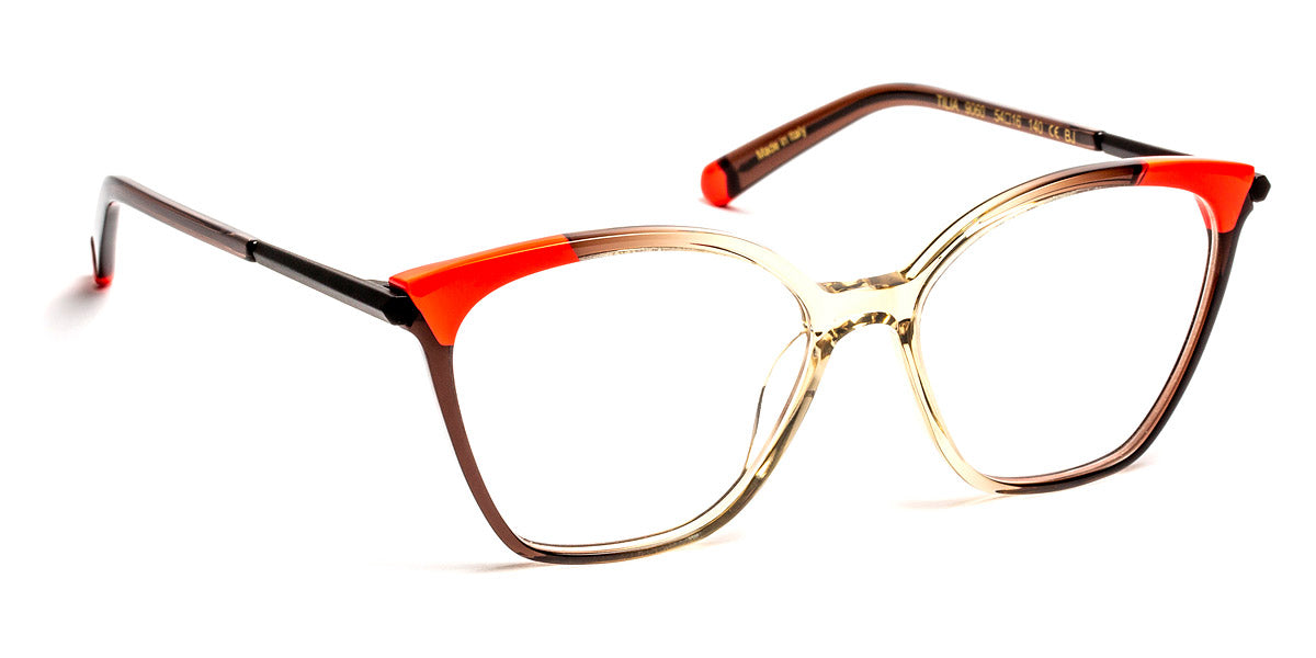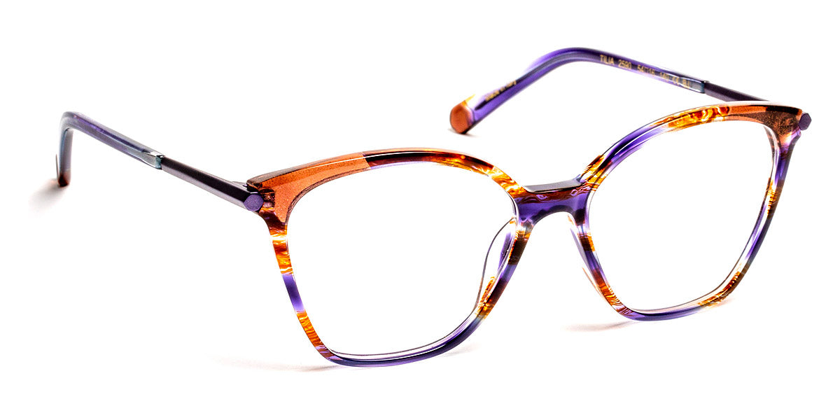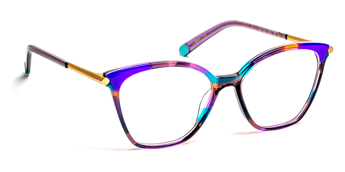 Tilia Eyeglasses by J.F. Rey. Color: 2590 Purple and Toffee Gradient/Brown Glossy, 3840 Green and Pink Gradient/Green, 7070 Rainbow/Purple, 9060 Brown Gradient Transparent/Coral, Size: 54-16-140. Introducing the Tilia from J.F. Rey's innovative HYBRID collection. More than just a fashion statement, these classic cat-eye frames are a perfect blend of style and functionality. Precision crafted, the Tilia combines the strength and durability of metal with the versatility and vibrant colors of acetate. Get ready to experience a new level of comfort with these modern and elegant frames. Designed to fit your face perfectly, each element is meticulously crafted to ensure a seamless fit. With the Tilia, you'll not only see clearly, you'll look effortlessly chic. Whether you're at work or out with friends, these glasses will make a statement wherever you go.