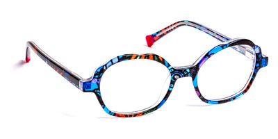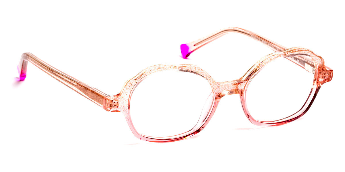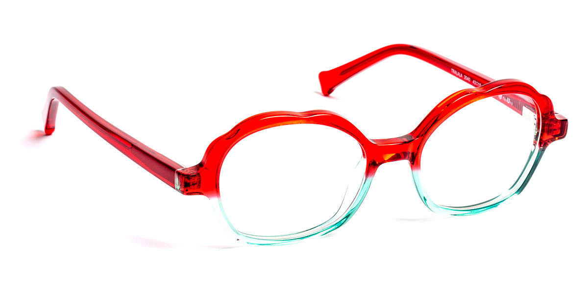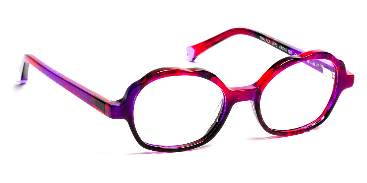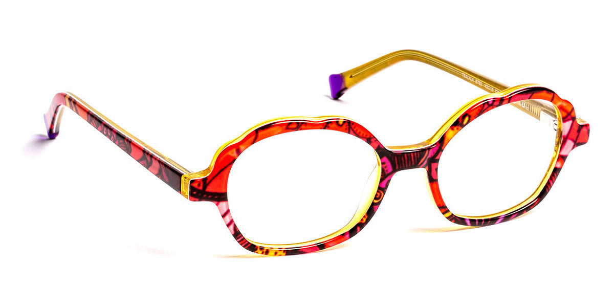 Tralala Eyeglasses by J.F. Rey. Color: 2575 Flower Blue/Pink, 3040 Red/Green, 3575 Red/Plum Lace, 8080 Glitter Pink, 8750 Flower Pink/Yellow, Size: 43-15-120. Introducing the TRALALA frame by J.F. Rey, a whimsical masterpiece that lives up to its name perfectly. Crafted from acetate and inspired by a surrealistic universe, these frames boast playful shapes and captivating colors designed to capture children's attention. Choose from a delightful array of vibrant gradients, artistic paintings, glitter accents, and bold, shiny shades of red. Adding a charming finishing touch, a small heart adorns the temple, ensuring that every detail of the TRALALA frame delights and enchants.