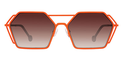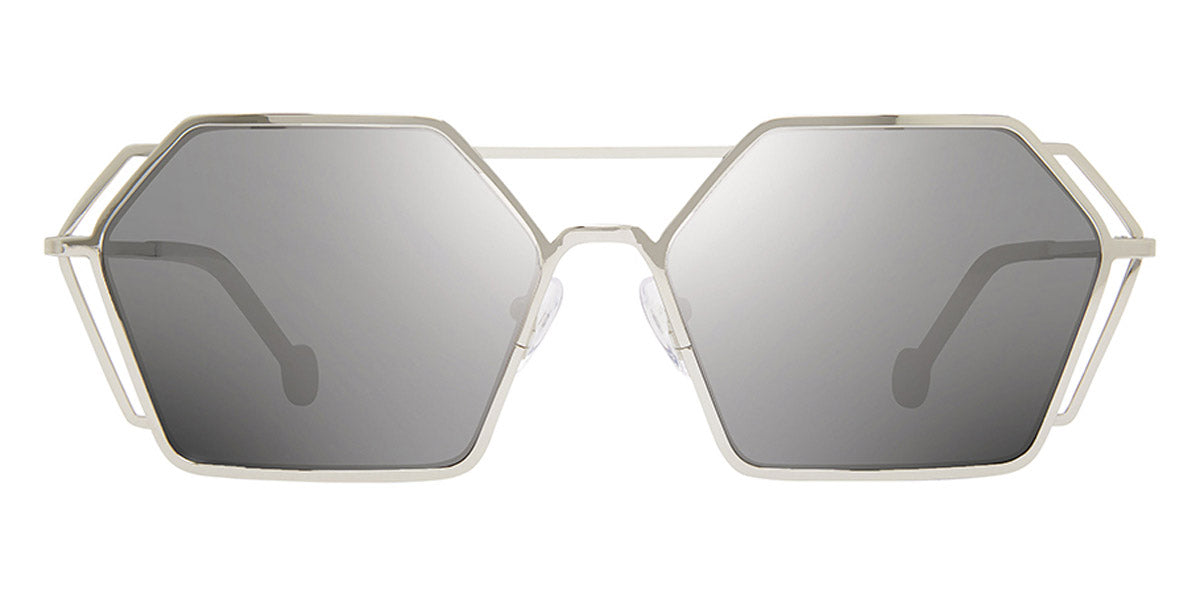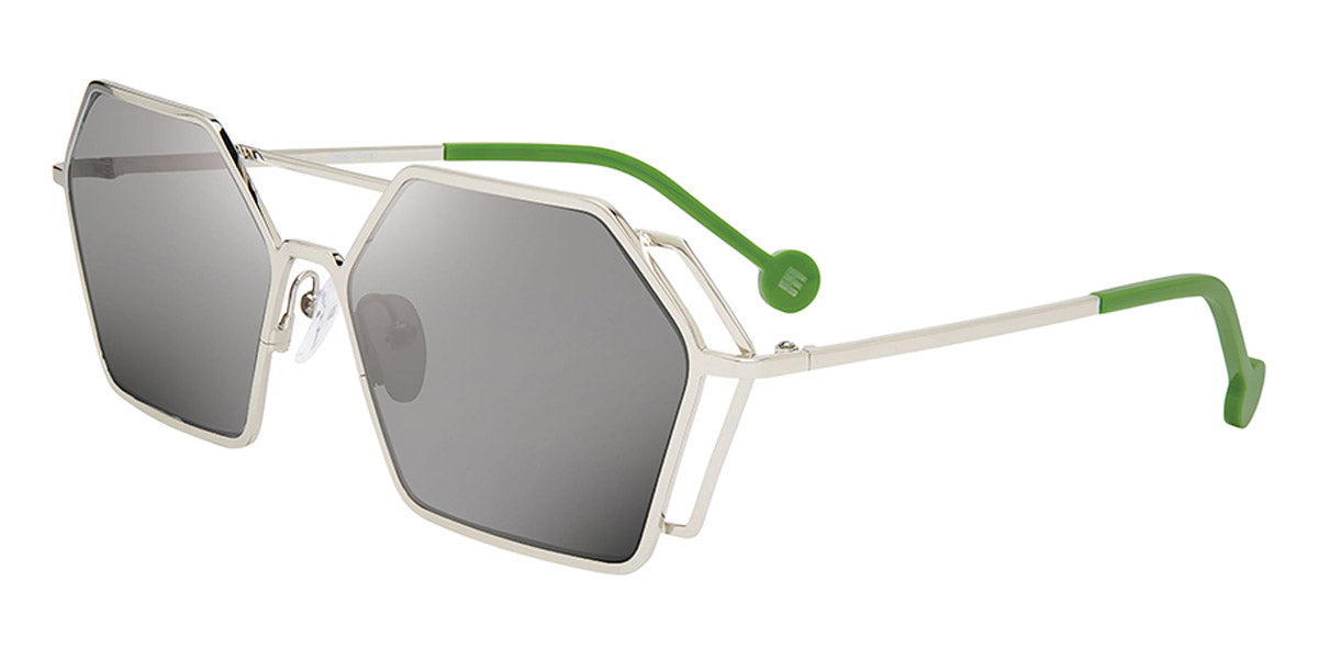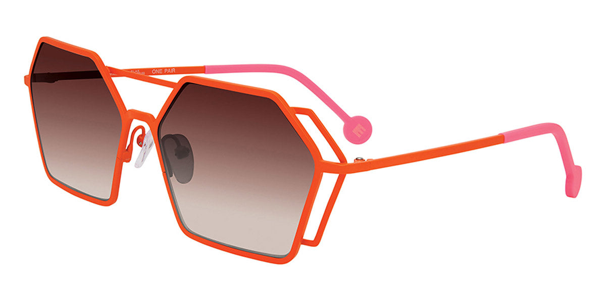 GASPARI Sunglasses by L.A.Eyeworks. Material: Stainless Steel Sunglass, Size: 61-16-135, Color: Orange with Pink Temple Tips, Silver with Green Temple Tips. Meet the GASPARI sunglasses from the limited edition Sun'22 collection by l.a.Eyeworks, the perfect fusion of fashion and functionality. With a touch of opulence, these sunglasses feature stainless steel frames adorned with intricate geometric contours. Indulge in a bold and flamboyant style by choosing these sunglasses for those who crave a bold and extravagant look. Seize the opportunity to outshine even the wealthiest individuals in the ongoing space race with GASPARI, as its meticulously crafted minimalist design propels you to the highest speeds. Its mirrored finish envelops the sunglasses, reflecting an awe-inspiring, all-encompassing allure.