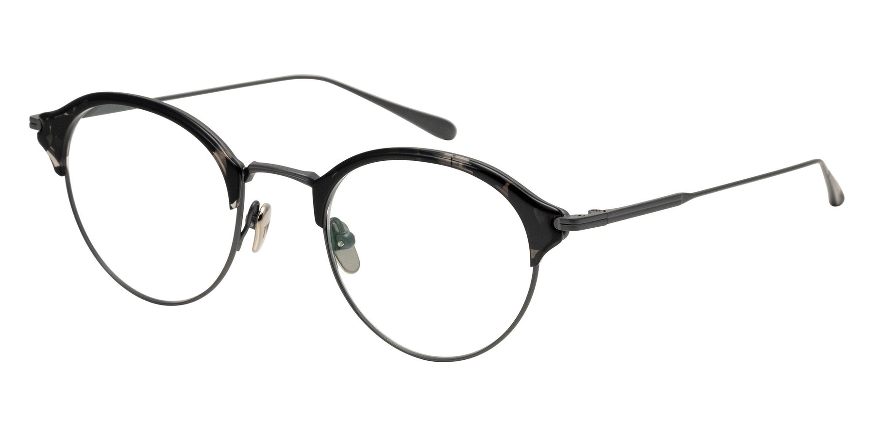 Masunaga® GRACE Eyeglasses by Masunaga®. Color: 49 BK/GP, 35 MOSAIC/GP, 29 BK/BK, 15 BL-BR/Silver, Size: 47-21-145. GRACE was born as the successor to the popular model "COCO. Combined with a new acetate fabric, it gives an elegant finish. The unisex Boston shape, and the beautiful design without any waste is achieved by using. It also leads to lighter weight. #35 is a new color with an impressive acetate fabric that looks like a cut out of the streetscape of Magic Hour. #29 is a new color with a different black texture due to the combination of a gradient-like clear black base, with a deep acetate fabric sprinkled with mottled patterns, and IP black.