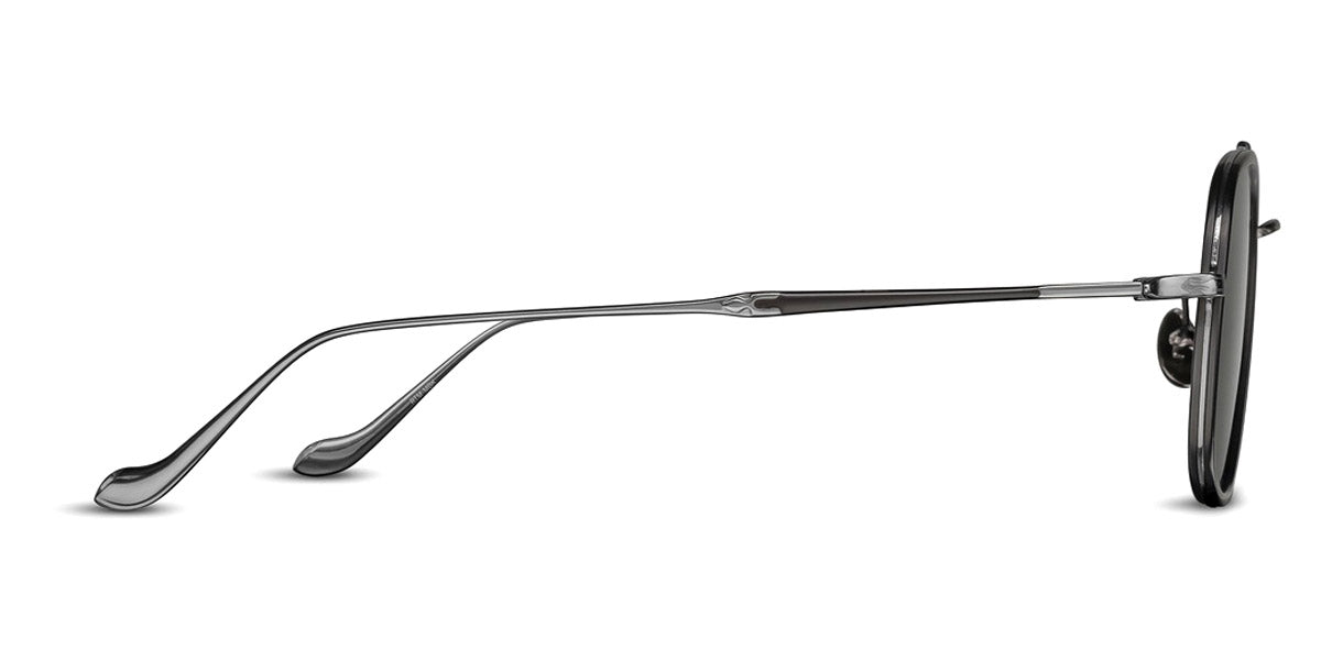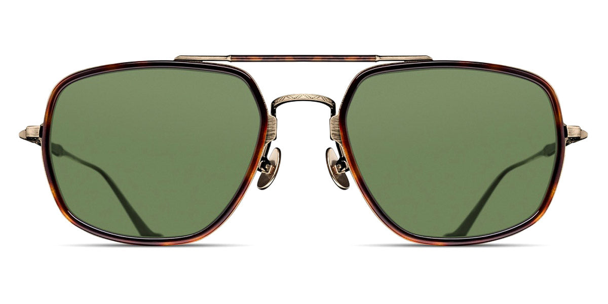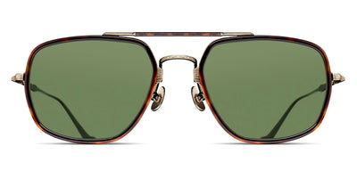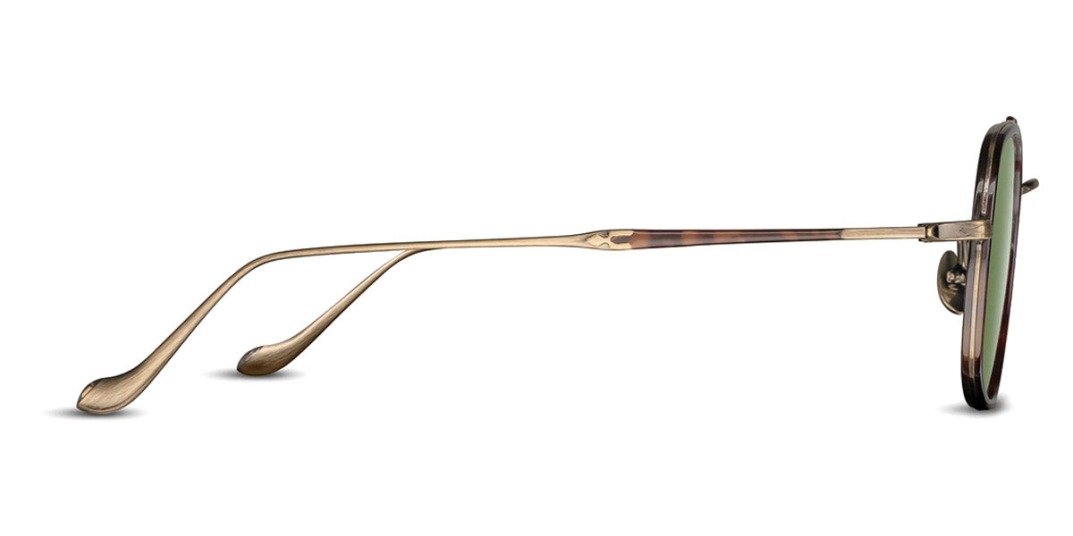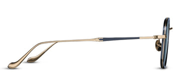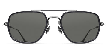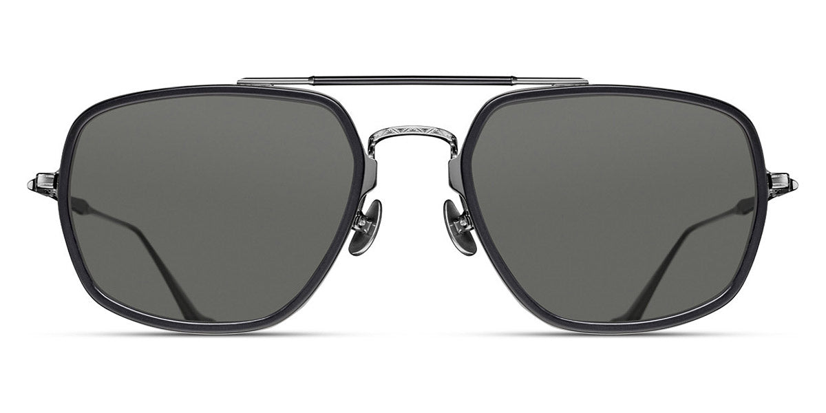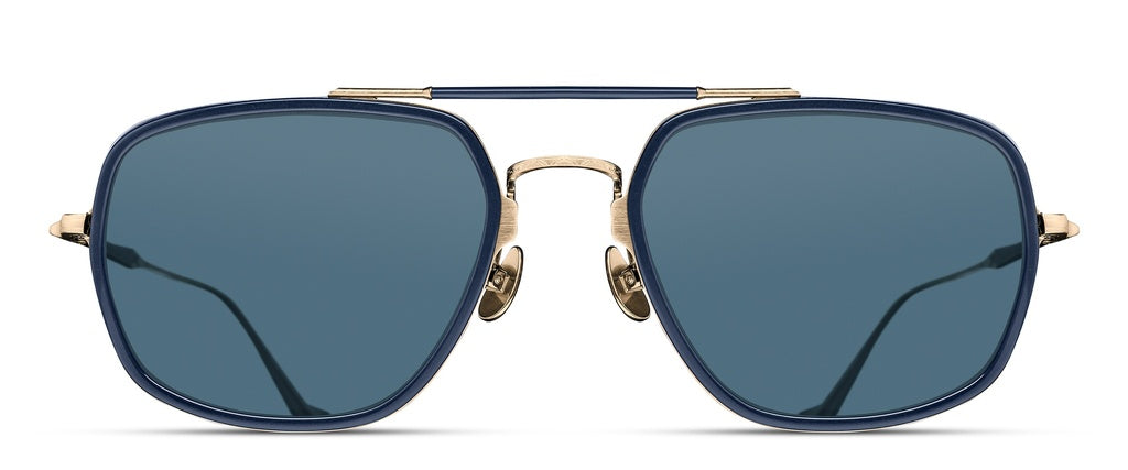 M3123 Sunglasses by Matsuda. Color: Brushed Gold/Navy / Blue Grey, Antique Gold/Dark Tortoise / Sage Green, Brushed Silver/Matte Black / Grey Gradient, Ruthenium/Matte Black / Grey, Size: 55-21-145. The Matsuda M3123 Sunglasses showcase the flawless combination of acetate and titanium, effortlessly blending a classic aviator shape with the modern aesthetic. These sunnies feature a Japanese acetate insert, Beta-titanium temples, and a hand-lacquered top bar, making them both bold and lightweight. With a UV protection coating, you'll be covered for those sunny days, while an anti-reflective coating ensures glare-free vision. A truly unique piece to own!