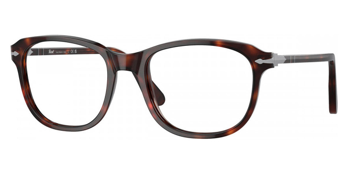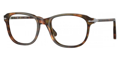 PO1935V Eyeglasses by Persol. Shape: Square, Material: Acetate, Frame Type: Full Rim, Color: 1052 Madreterra, 108 Caffe, 24 Havana, 95 Black, Size: 51-19-140, 53-19-145.