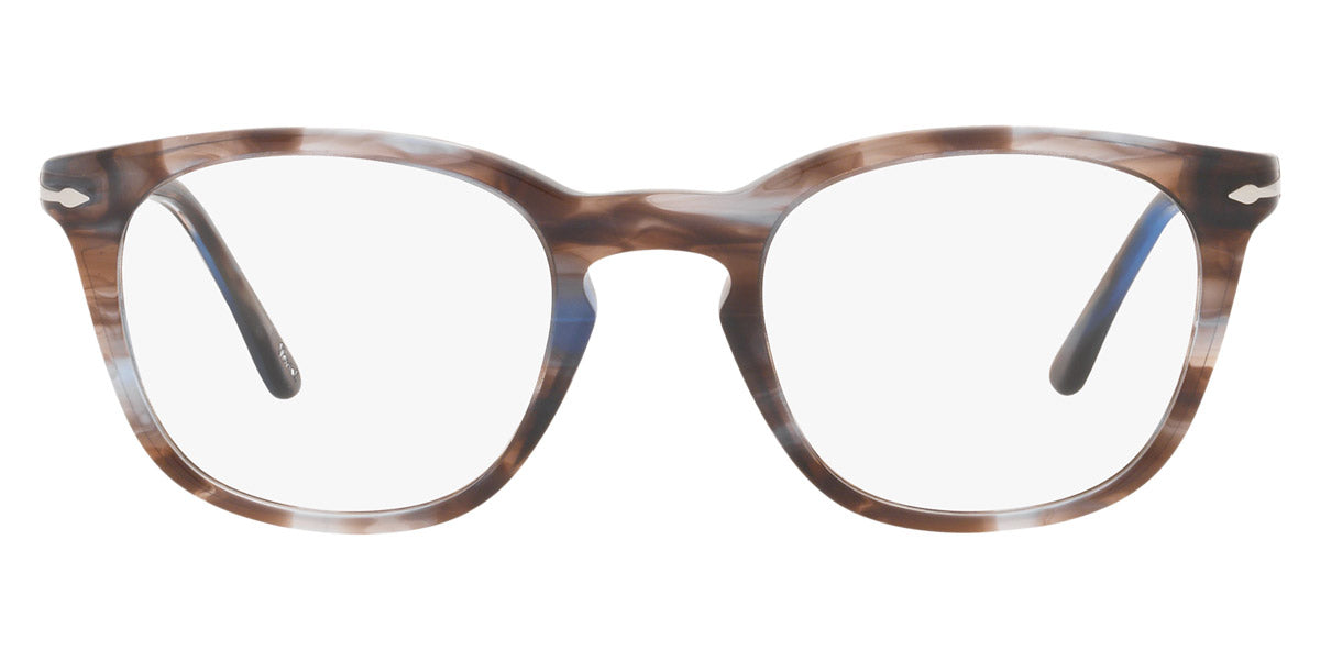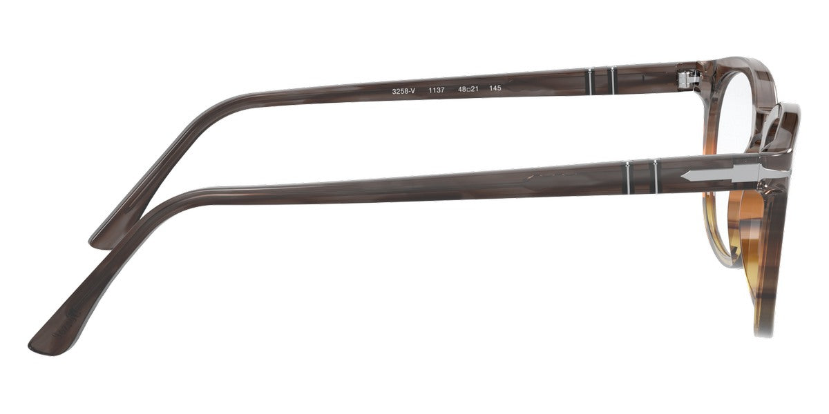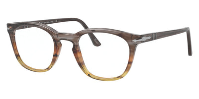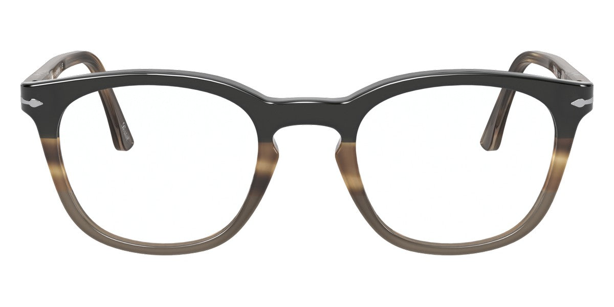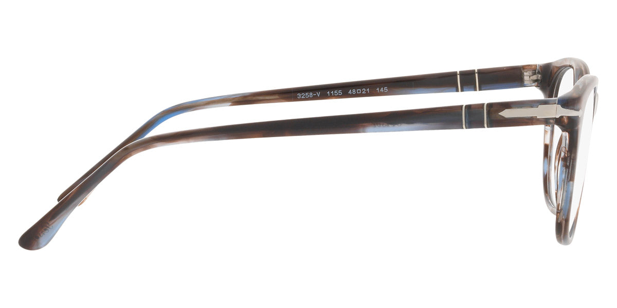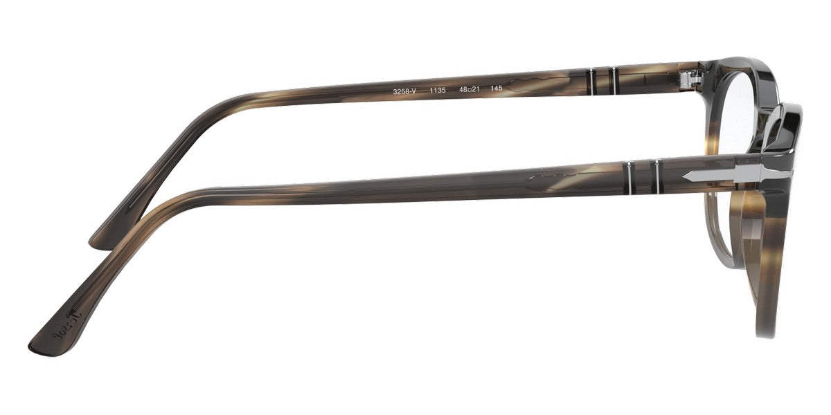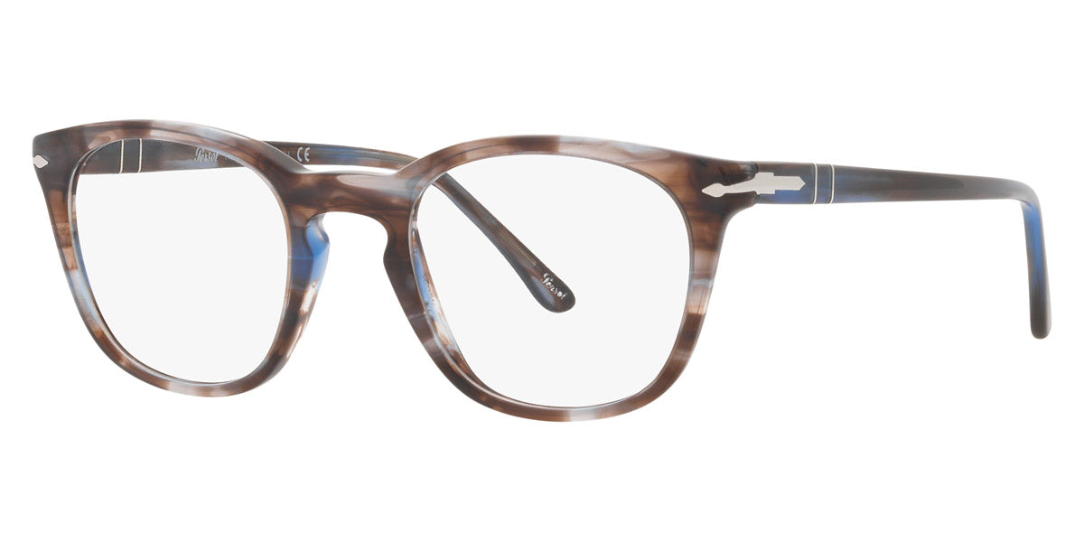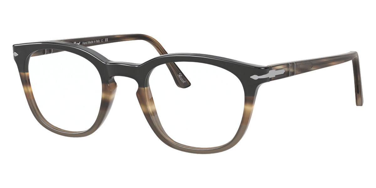 PO3258V Eyeglasses by Persol. Shape: Wayfarer, Material: Plastic, Frame Type: Full Rim, Color: Striped Brown/Gray/Black, Striped Gray/Gradient Brown, Havana, Black, 1155 Striped Blue, Size: 48-21-145.