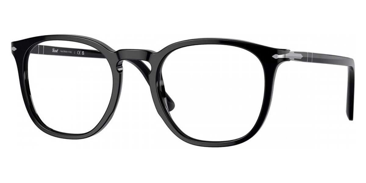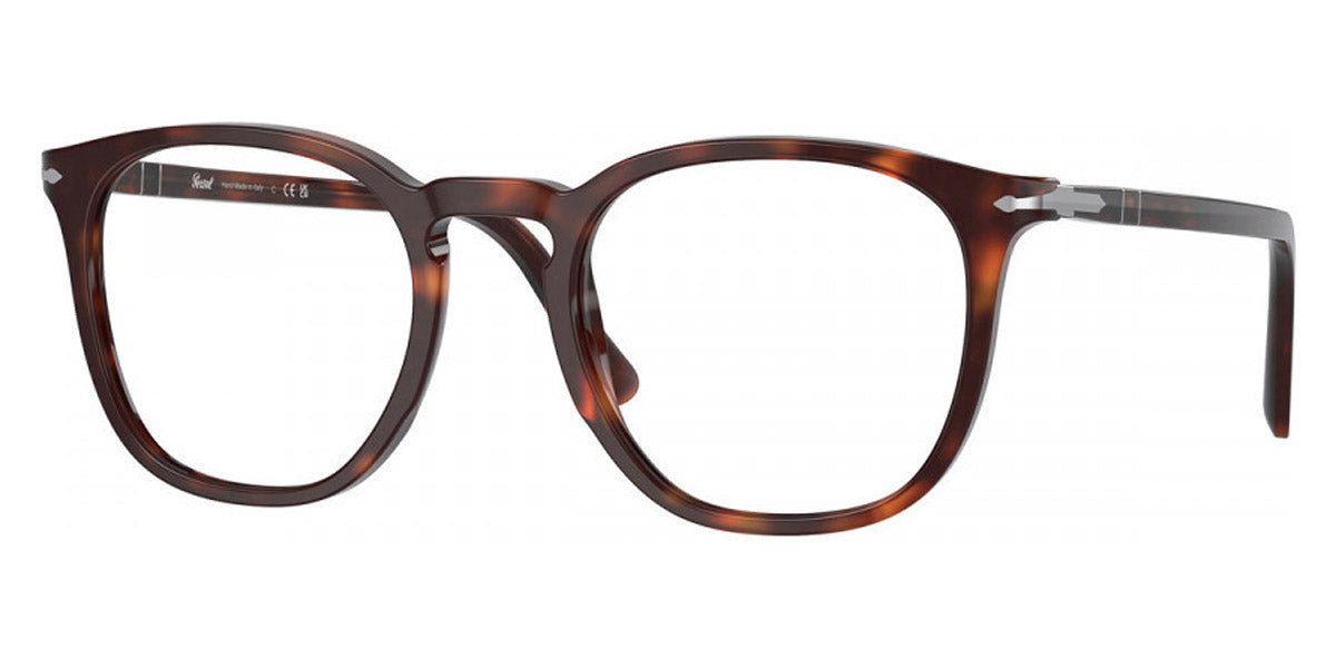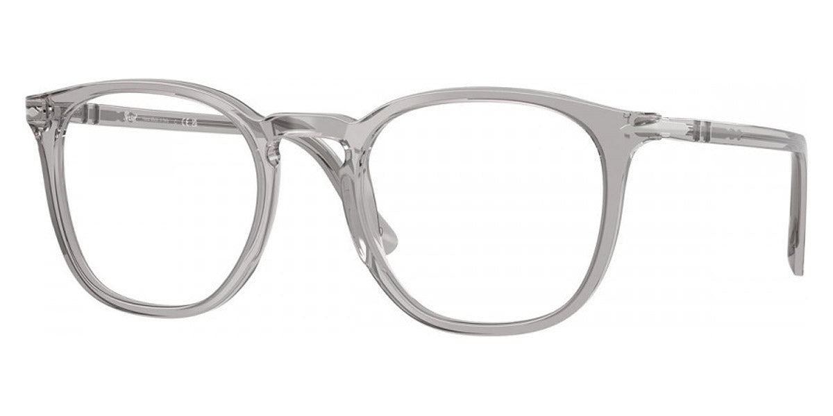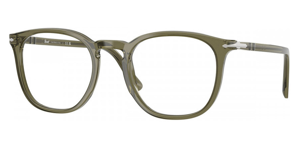 PO3318V Eyeglasses by Persol. Shape: Wayfarer, Material: Acetate, Frame Type: Full Rim, Color: 1142 Olive Transparent Green, 1188 Matte Dark Green, 1202 Transparent Navy, 204 Miele, 24 Havana, 309 Transparent Grey, 95 Black, Size: 49-21-145, 51-21-145.