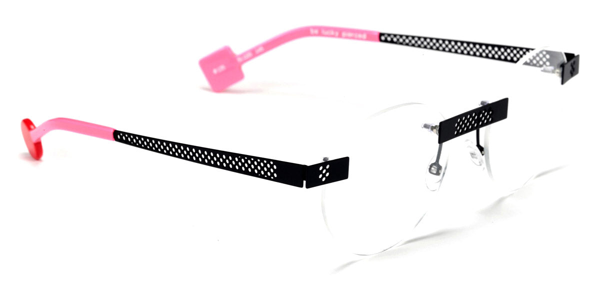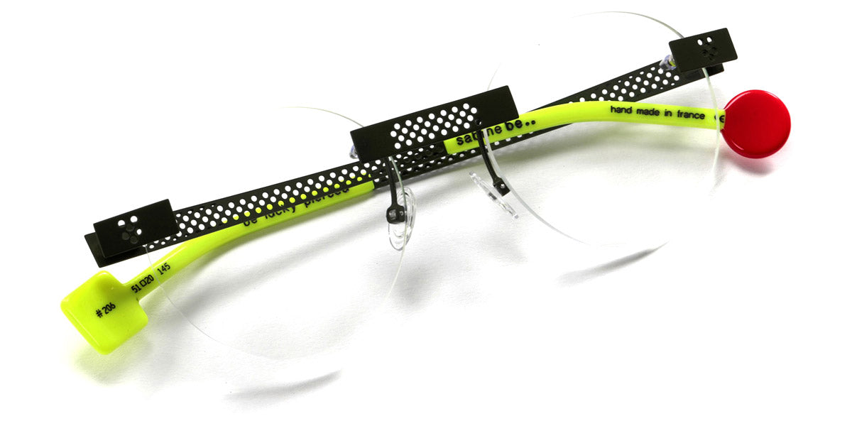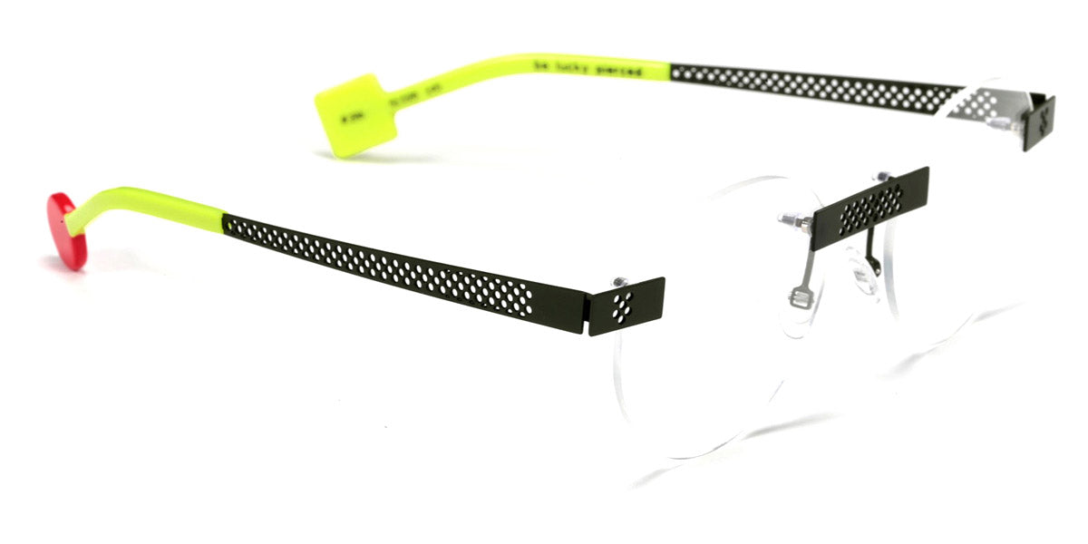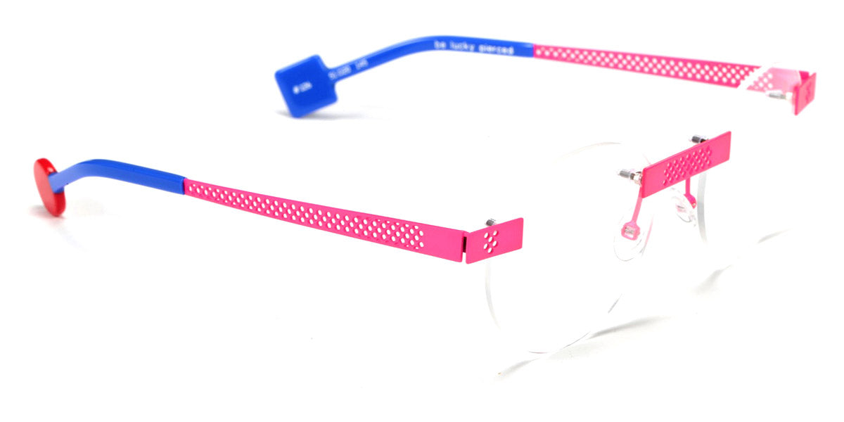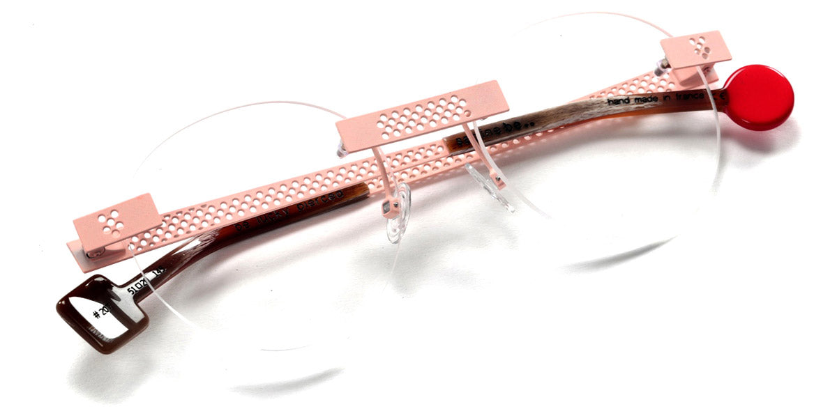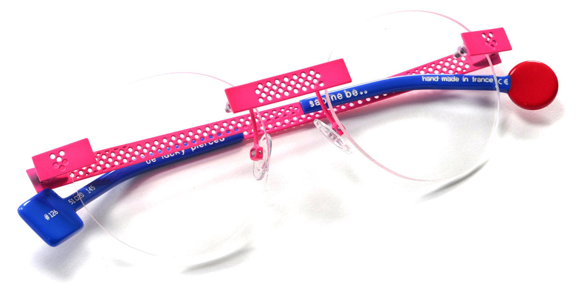 Be Lucky Pierced Eyeglasses by Sabine Be. Color: Satin Neon Pink, Shiny Midnight Blue, Satin Khaki, Satin Salmon, Size: 51-20-145. The Be Lucky Pierced eyeglasses are designed for individuals who favor bold, innovative designs. Sabine Be has created a pair of eyeglasses that serve as a unique accessory, effortlessly blending daring fashion with functionality. These frames capture attention and bring a sense of playfulness to everyday wear, making them perfect for those who enjoy expressing their personality through eyewear. Whether in a professional setting or casual environment, the Be Lucky Pierced eyeglasses stand out as a fresh, stylish addition to any collection.