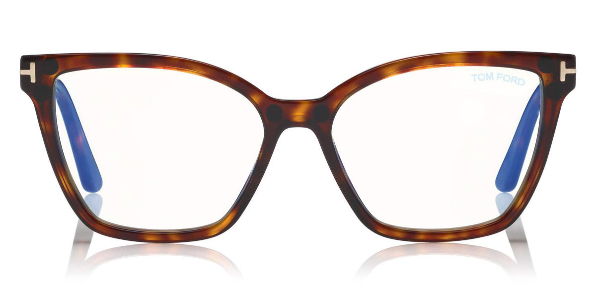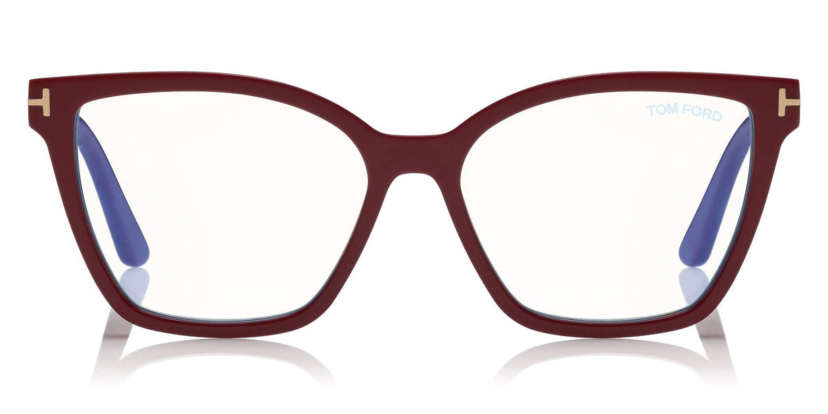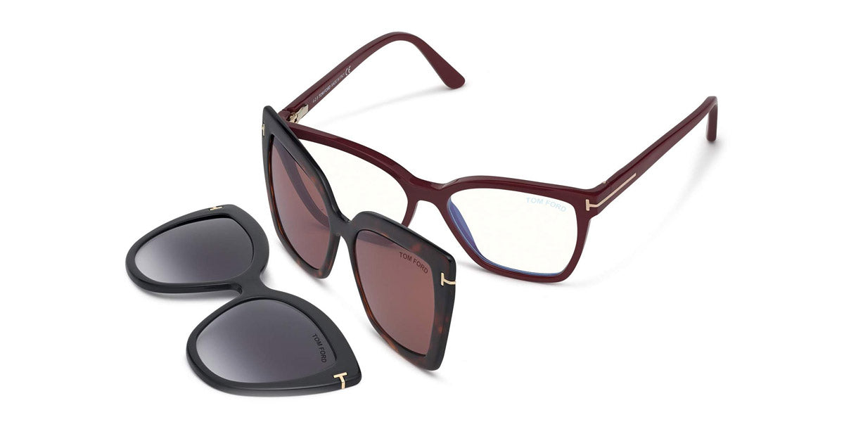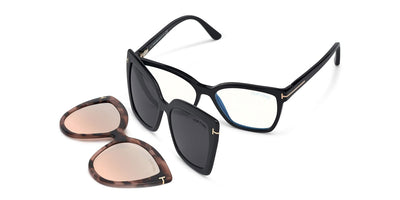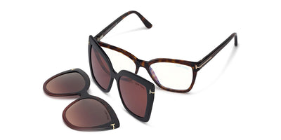 FT5641-B Eyeglasses with Clip-on by Tom Ford. Color: Fuchsia / Blue Block / Clips: Red Havana & L. Brown / Black & Grad. Smoke, Red Havana / Blue Block / Clips: Black & Burgundy / Havana-To-Rose & Wine, Black / Blue Block / Clips: Black & Smoke / Pink Havana & Rose Flash. Size: 53-15-140.
