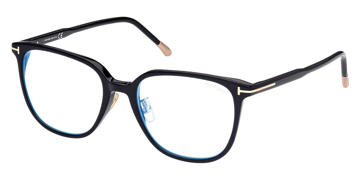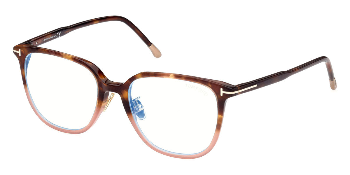 FT5778-D-B Eyeglasses by Tom Ford. Color: 052 - Shiny Classic Dark Havana, t" Logo / Blue Block Lenses", 055 - Shiny Medium Havana To Milky Pink, t" Logo / Blue Block Lenses", 001 - Shiny Black, t" Logo / Blue Block Lenses". Size: 53-18-145.