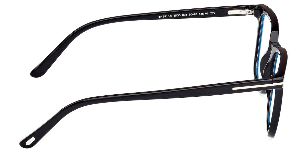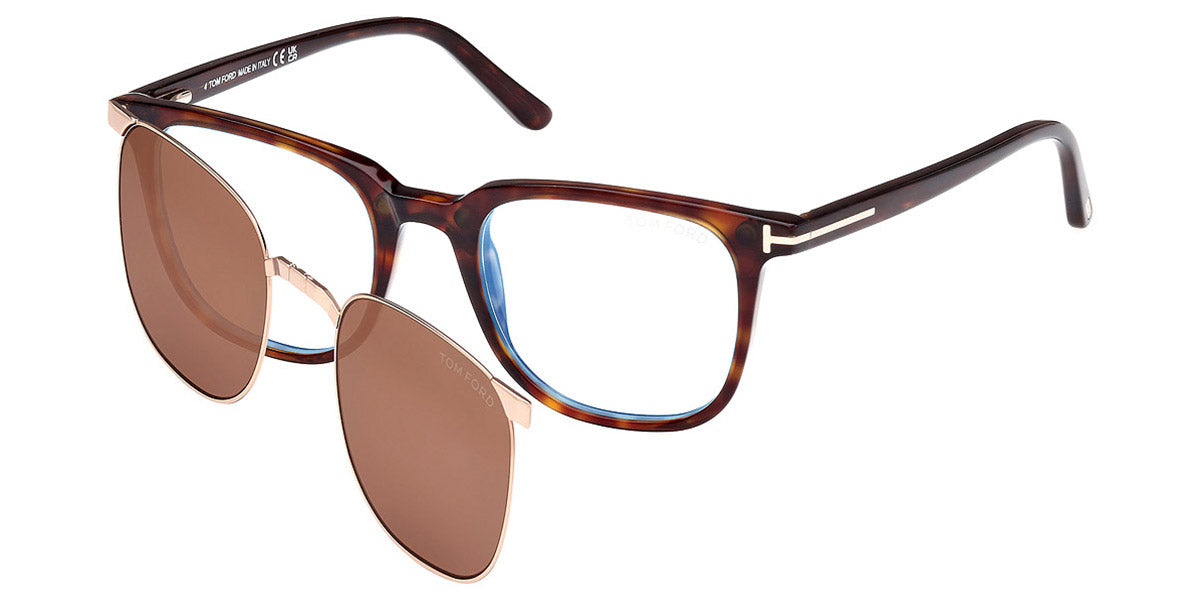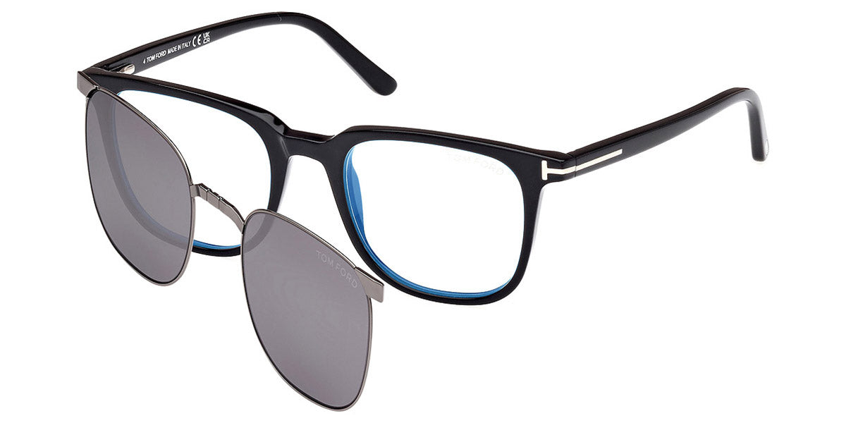 FT5916-B Eyeglasses with Clip-on by Tom Ford. Color: 001 - Shiny Black / Shiny Black, 052 - Dark Havana / Dark Havana. Size: 50-20-145.
